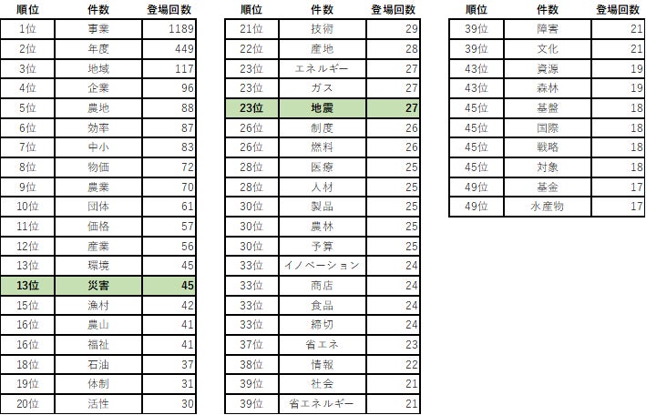 2024年2月に登録をした1,176件の補助金・助成金情報について、件名に登場するキーワードを分析しました。下記の表は登場回数が多い上位50のランキングです。先月はランキング外であった「地震」が23位で登場したほか、「災害」が13位という高い順位になっていました。これは能登半島地震が発生したことで、それに関連した補助金情報が掲載されたことによります。