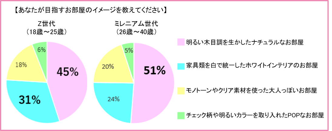 今回の結果から、Z世代が目指しているお部屋のイメージは“落ち着いた色合いのシンプルなお部屋”であることがわかりました。また、ミレニアム世代の回答では「明るい木目調を生かしたナチュラルなお部屋」の回答が51%と高い傾向にあることがわかりました。