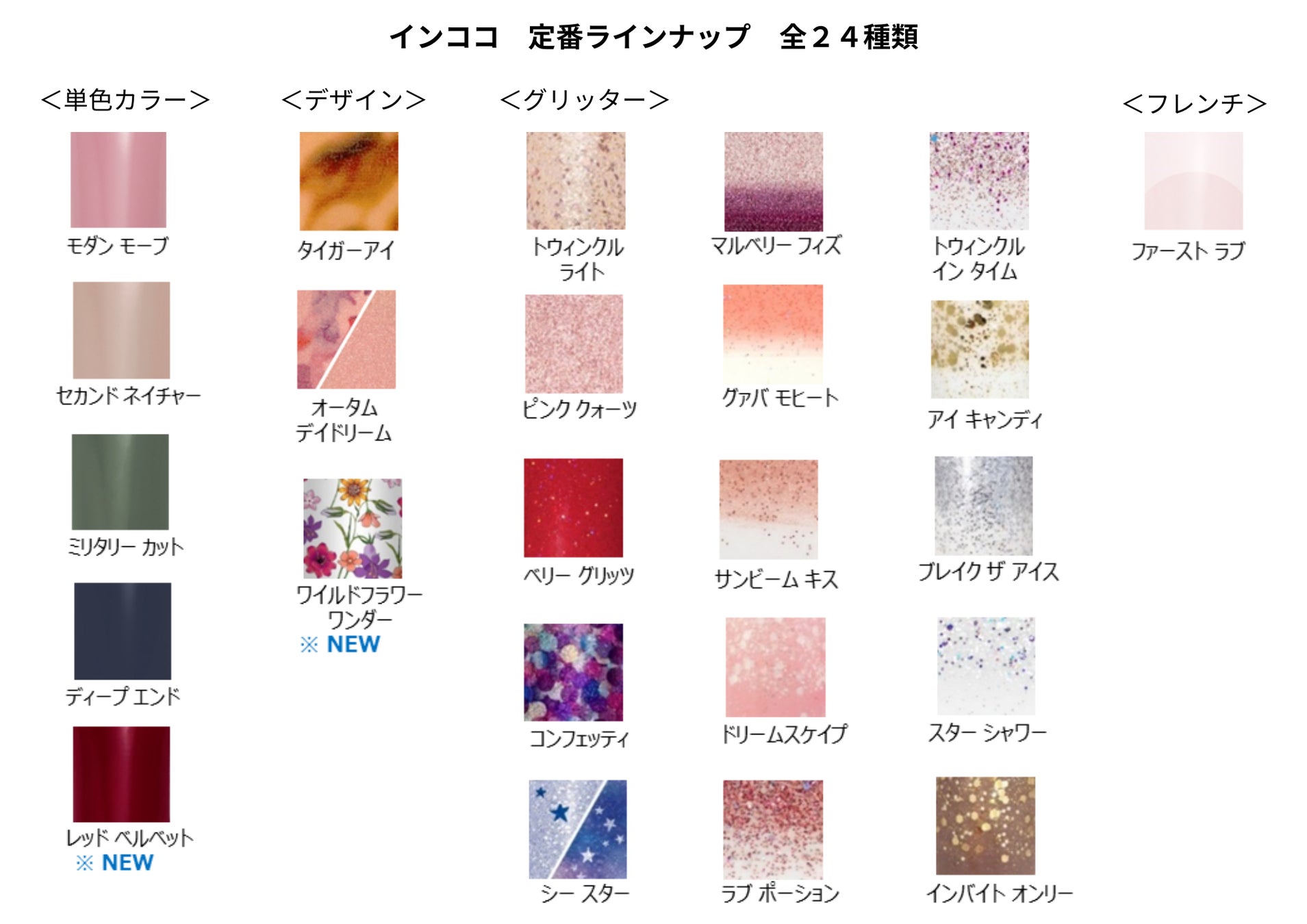 時間も道具もテクニックも使わずに手軽にサロン級のセルフネイルを楽しめる、貼るタイプのマニキュアブランド「インココ」は、3月6日(水)に発売した追加色2種を加え、全24種の定番ラインナップとなりました。