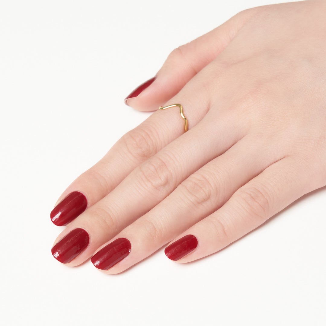 深みのあるダークレッド、いわゆる真紅のワンカラーネイルです。鮮やかな赤ですが、上質なベルベットのような落ち着いた色味でもあるので、オトナっぽくシックな印象を与えてくれます。上品なファッションにも合わせやすく、ゴールドやブラウン系ネイルと組み合わせ