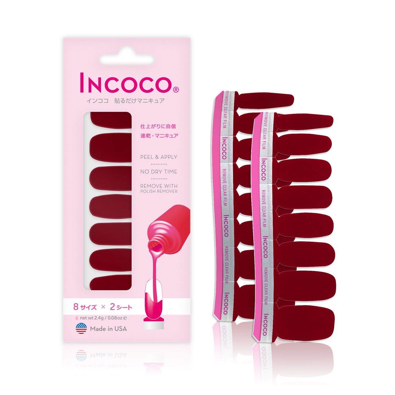「INCOCO」は液体のマニキュアを特殊技術でソフトシート化したものなので、とても薄くて伸張性にすぐれ、爪へのフィット感も抜群です。また、薬機法の規定をクリアした「化粧品(種別:マニキュア)」 です。紙やプラスチック製シール等の「雑貨」区分とは異なります。