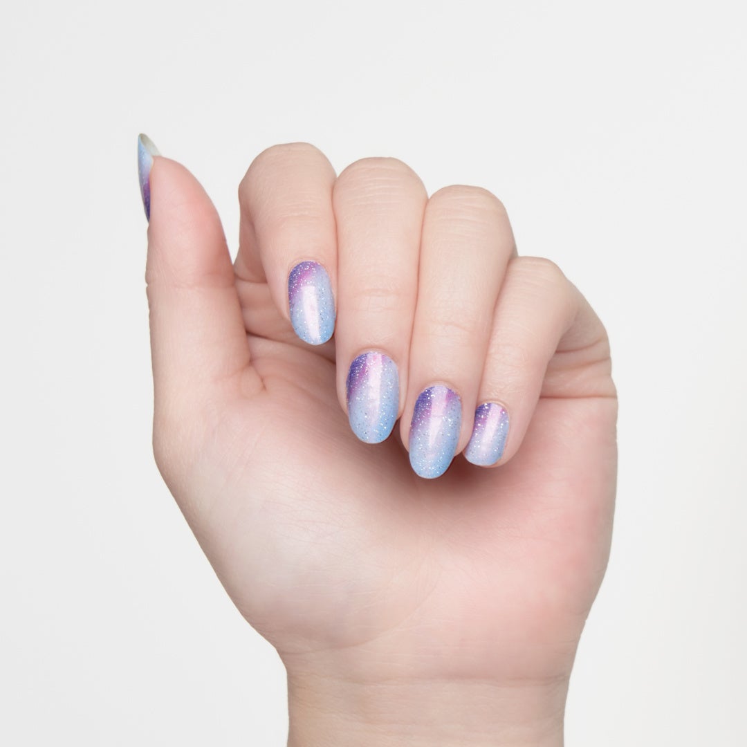ライトブルーを基調とした、変形グラデーションのグリッターネイルです。光を浴びると放つオーロラのような輝きや、散りばめられた細やかなマルチカラーのラメが、宇宙や異次元を想像させるような神秘的な雰囲気です。光沢と発色が美しく、フットネイルにもオススメのデザイン。