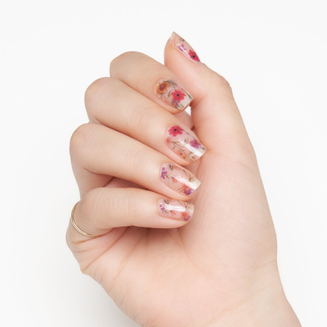 クリアベースの花柄ネイルです。絵画のようなタッチで描かれた色とりどりのフローラルモチーフです。伸びやかで大胆さもあるデザインですが、ベースがクリアなので軽やかな着け心地。ライトカラーの単色ネイルに重ねて使うのもオススメです。
