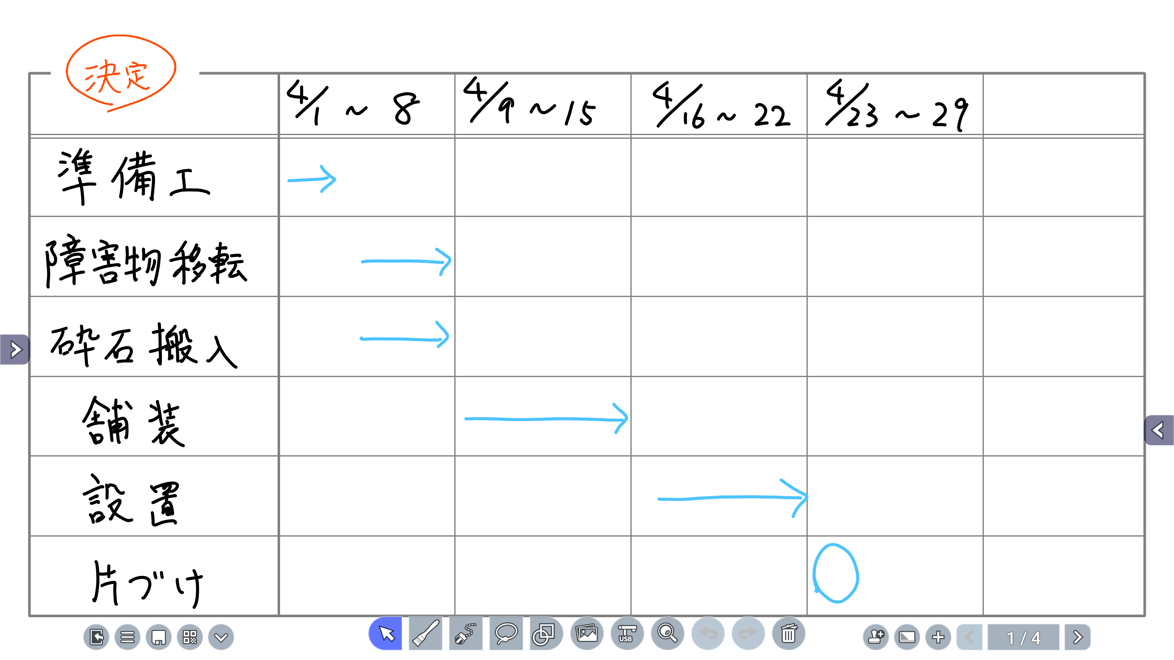 現場で使える背景を用意してあるので導入してすぐにスケジュール表や工程表、クロノロジー(経時活動記録)として活用できます。また、実物のスチールホワイトボードのネームプレート代わりに使えるテキストボックス作成機能を新規に搭載しています。