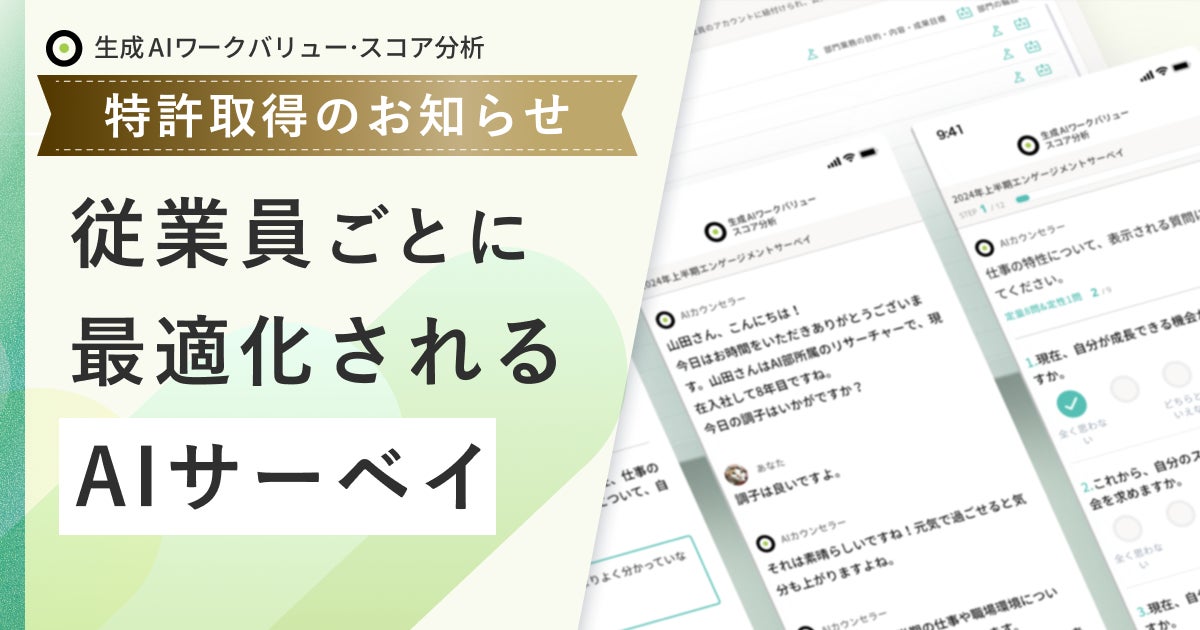 AIエンゲージメントサーベイ「生成AIワークバリュー・スコア分析」(JOB Scope)/「アンケートの質問を作成するプログラム、装置及び方法」特許取得のお知らせ