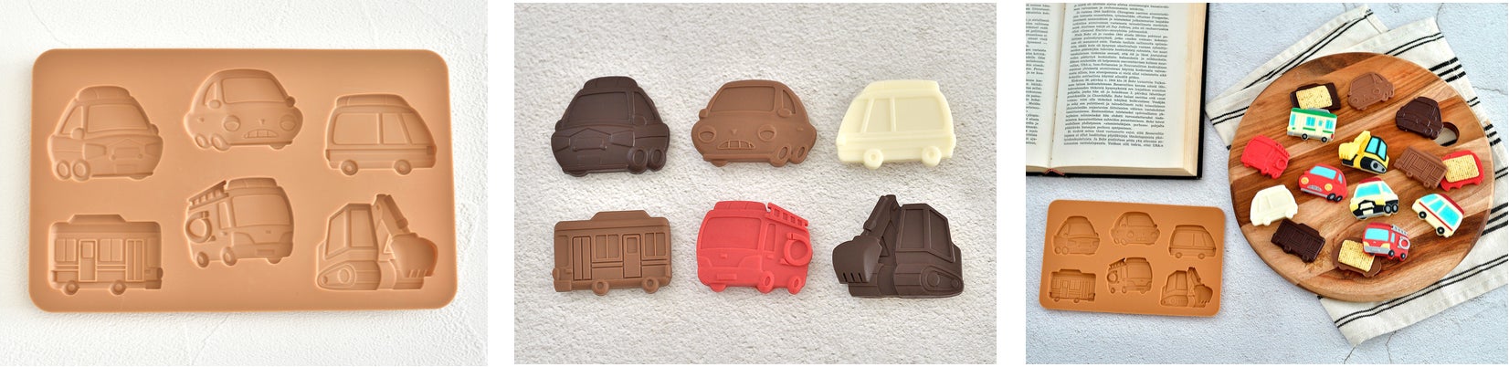 今回新しく発売するのは、パトカー、乗用車、救急車、バス、消防車、ショベルカーの6種の車型チョコレートが作れるシリコンモールドです。コロンとしたかわいらしいフォルムながらも、それぞれの特徴的な部分を細かく表現しており、子どもはもちろん、大人もワクワクが止まりません。そのままチョコレートを流すだけでも十分かわいく仕上がりますが、クッキーを合体させてサクサク食感が楽しいクッキーチョコを作るのもおすすめ。