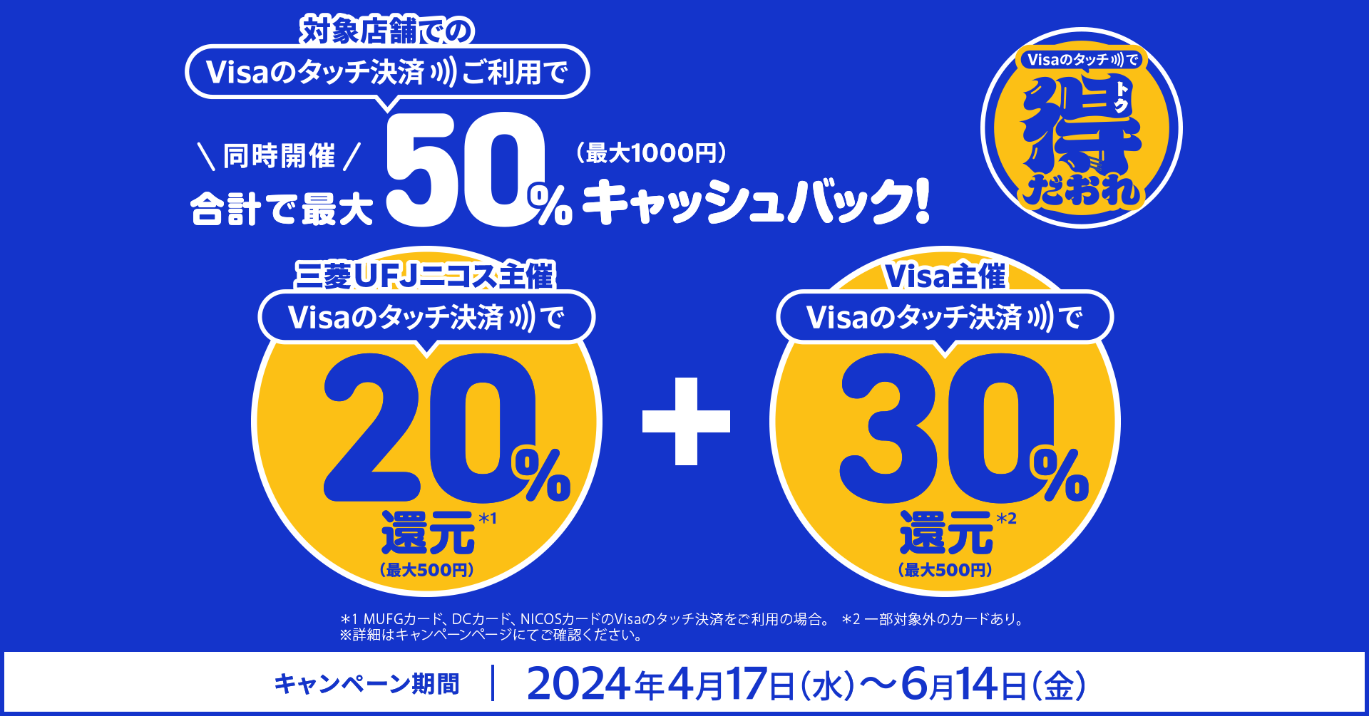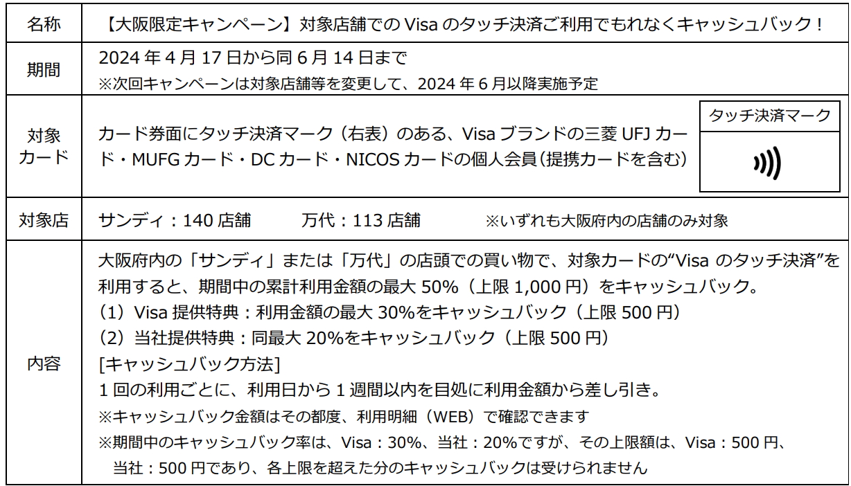 三菱UFJニコスはこの度、ビザ・ワールドワイド・ジャパン株式会社(本社:東京都千代田区、代表取締役社長:シータン・キトニー、以下Visa)と共同でVisaブランドの三菱UFJカード・MUFGカード・DCカード・NICOSカードの個人会員(提携カードを含む)向けに大阪府の対象店舗での“Visaのタッチ決済”利用促進キャンペーンを企画、その第1弾として4月17日から6月14日まで、食品スーパー「サンディ」(大阪府内140店舗)と「万代(まんだい)」(同113店舗)での利用で、期間中の累計金額の最大で50%をもれなくキャッシュバック(上限1,000円)するキャンペーンを実施します。