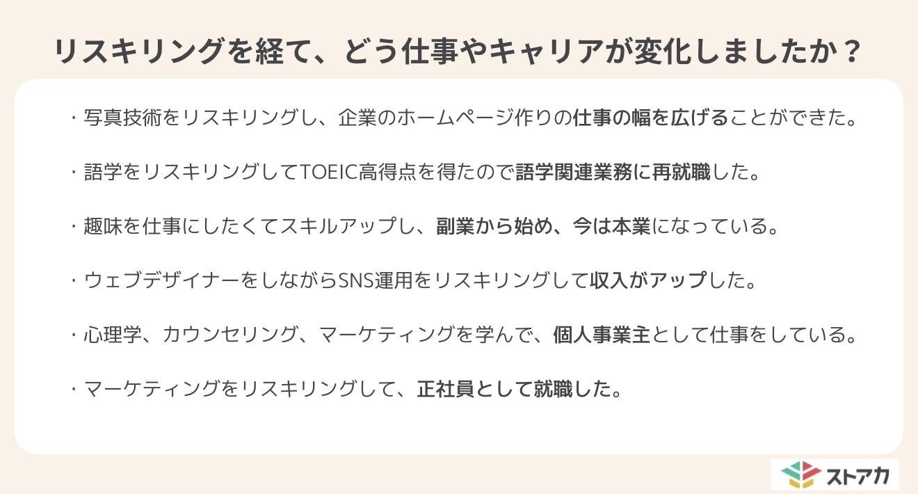 趣味から本業になった方、個人事業主としてスタートした方、再就職された方など、リスキリングを経て既に新たな仕事に取り組んでいる主婦が多く見受けられました。