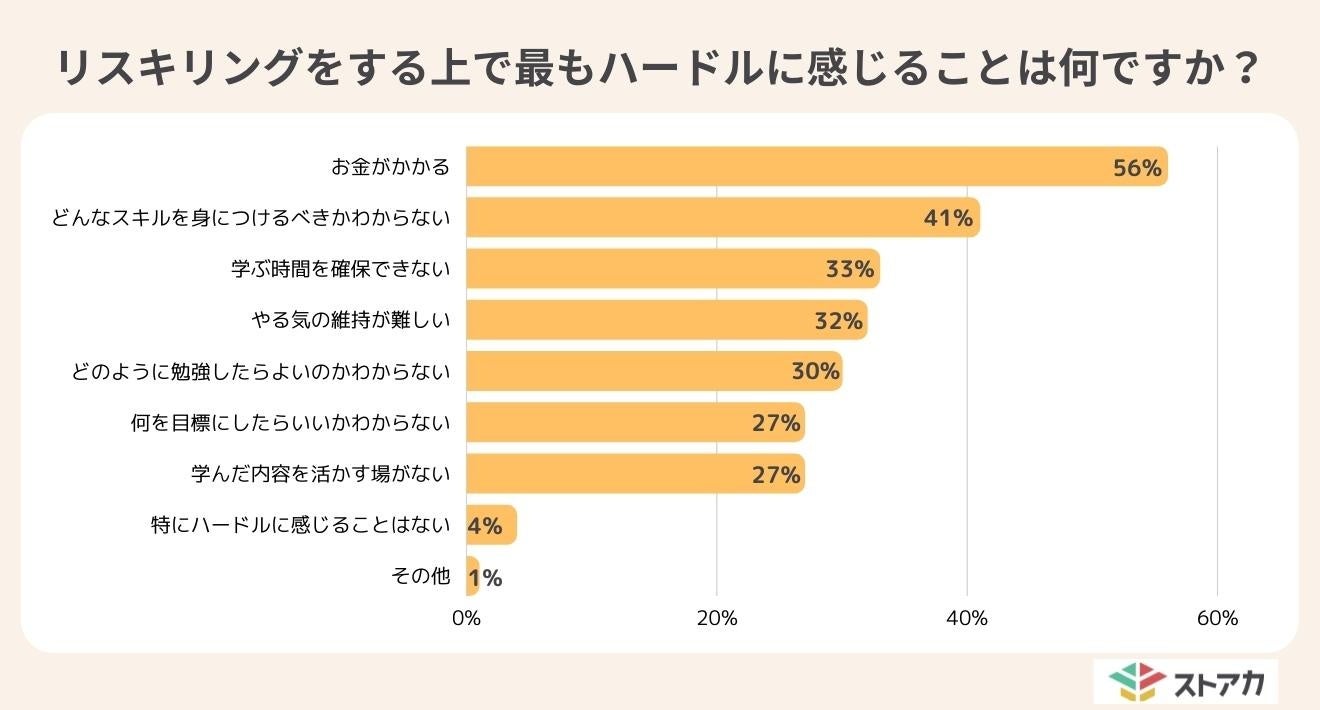 「リスキリングをする上でハードルに感じること」を尋ねた結果、第1位は「お金がかかる(金銭面)」、第2位「どんなスキルを身につけるべきかわからない」、第3位は「学ぶ時間を確保できない」という結果になりました。会社や団体が提供するリスキリング研修等ではない”個人で行うリスキリング”において、スキル取得にかかる費用が一番のハードルになっていることが見受けられます。また、身に着けるべきスキルに悩んでいる方は全体の4割にのぼり、スキルの棚卸しや長期的にみたキャリアのサポートがあれば、よりリスキリングを後押しできると考えられます。時間面では「介護もあり時間がネックになっている」など、家庭の時間とバランスをとるのが難しいという意見もありました。