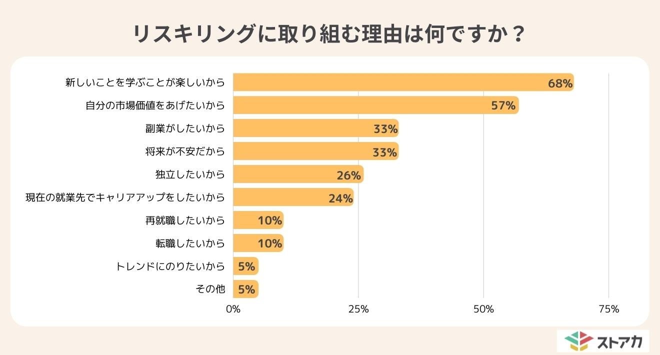 また第2位「自分の市場価値を上げたいから」からは、同時に再就職や転職、副業に向けて市場価値を上げるためのスキル取得を目指す方も多いことが見受けられます。主婦のリスキリングでは”学ぶ楽しみ”と”スキル取得による市場価値向上”の掛け算が重要だと考えられます。