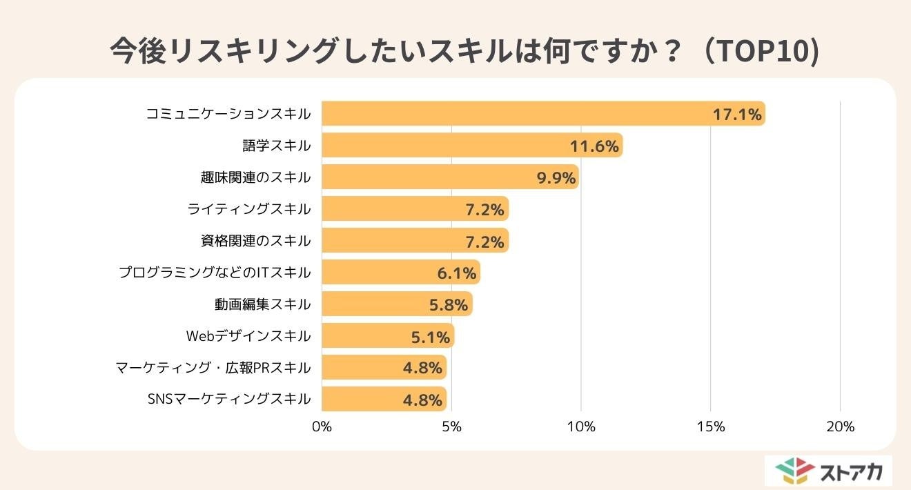 「今後リスキリングしたいスキル」を尋ねた結果、第1位「コミュニケーションスキル」、第2位「語学スキル」、第3位「趣味関連のスキル」となりました。