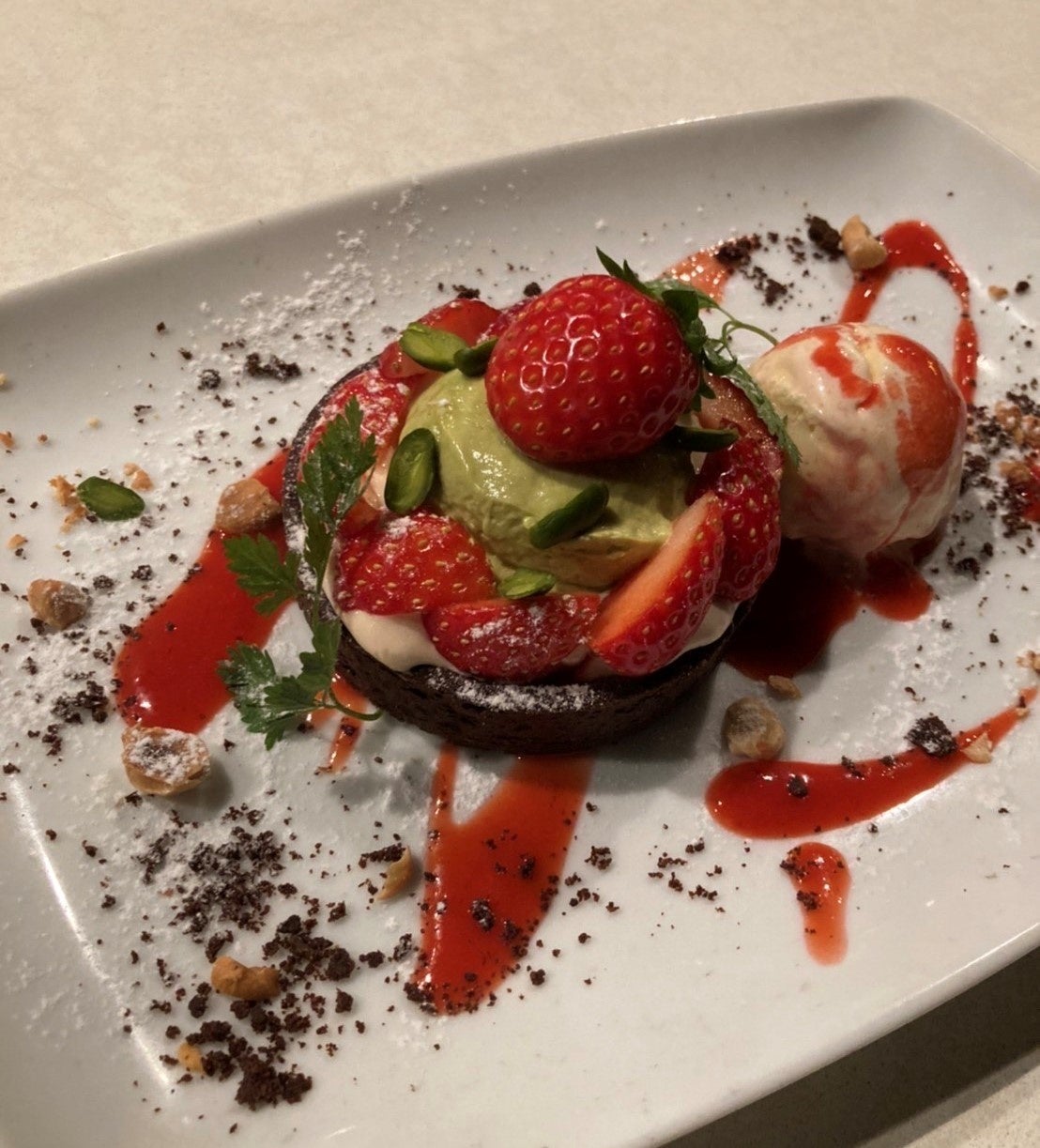 チョコレートのタルトに、ピスタチオとリコッタのムースをたっぷりと敷き詰め、その上にいちごをふんだんに盛り付けました。ストロベリーのジェラートと一緒にお召し上がりください。