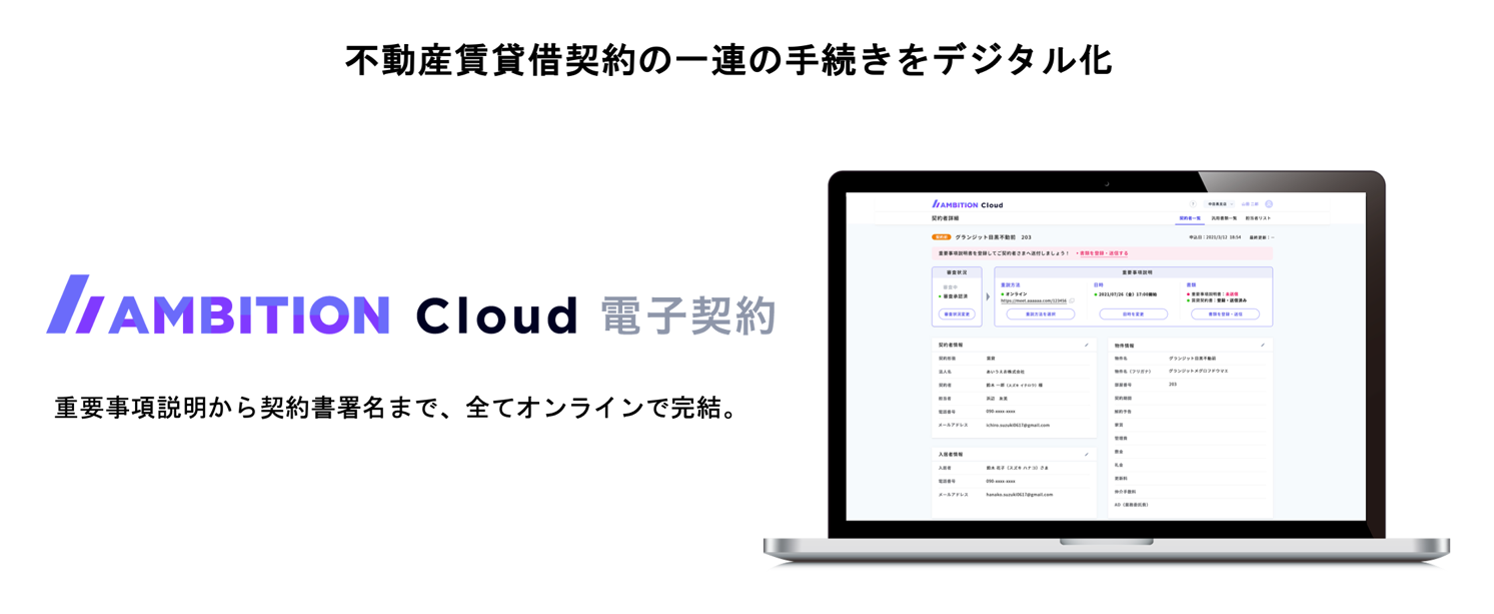 株式会社アンビション DX ホールディングス(東証マザーズ上場、証券コード「3300」、本社:東京都渋谷区、代表取締役社長 清水 剛、以下「当社」)が提供する不動産業界のDXを推進するITサービス「AMBITION Cloud」は、弁護士ドットコム株式会社(東証マザーズ上場、証券コード「6027」、本社:東京都港区、代表取締役社長 内田 陽介、以下「弁護士ドットコム」)が提供するWeb完結型クラウド契約サービス「クラウドサイン」とAPI連携し、重要事項説明から契約締結まで、全てオンラインで完結する新機能を、2022年2月から、当社賃貸DX賃貸仲介事業にて本格稼働を開始したことを、お知らせいたします。