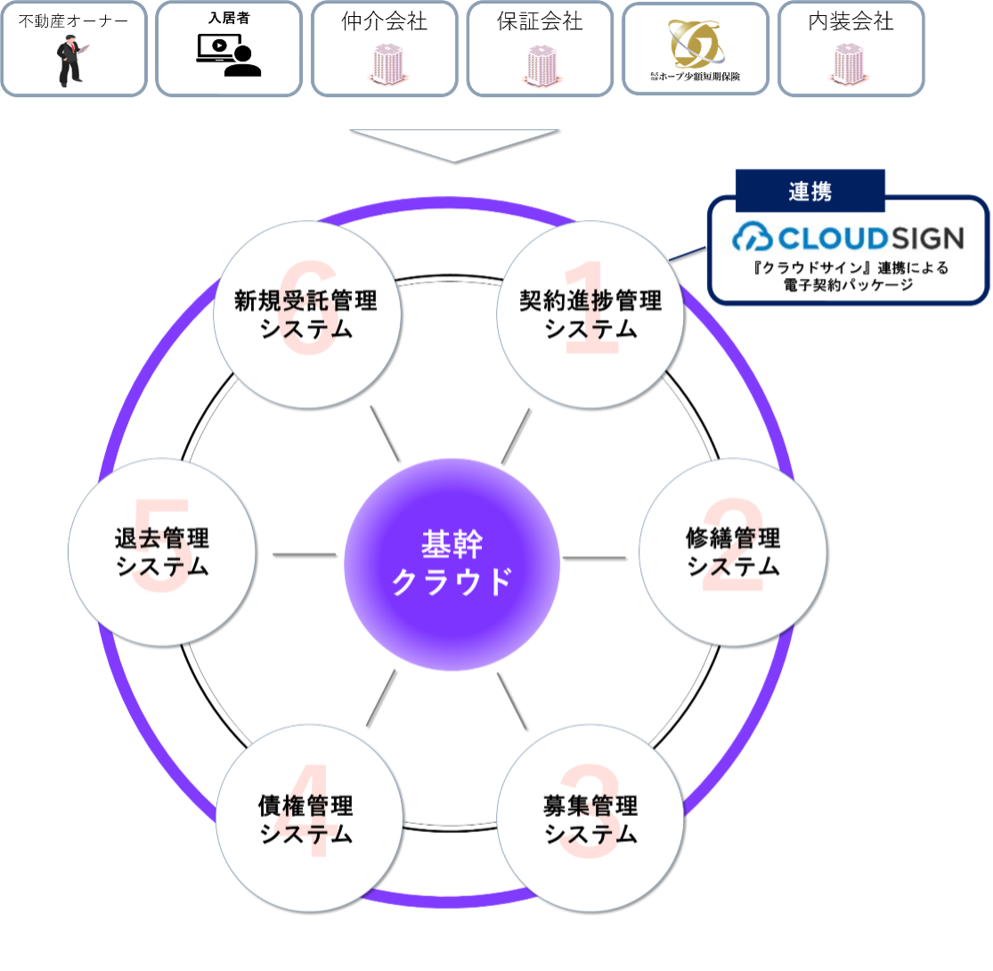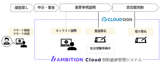 現在構築を進めている不動産の次世代管理クラウド「AMBITION Cloud」の追加機能として、弁護士ドットコムが提供するWeb完結型クラウド契約サービス「クラウドサイン」とAPI連携し、不動産賃貸契約に関わる一連の手続きをデジタル化、重要事項説明から契約締結まで全てオンラインで完結する新システムです。