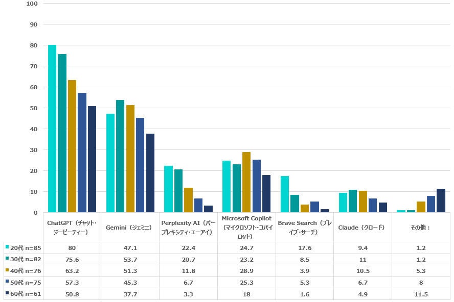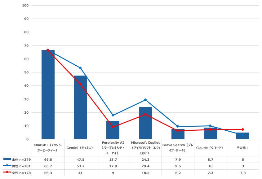 利用しているAIツールとしては、チャット・ジーピーティー(66.5ポイント)で、男女での差は認められませんでした。一方、2番手以下のツールでは性差が見られ、本設問が複数回答であることから、男性の方がジェミニやマイクロソフト・コパイロットといった複数のAIツールを使っていることが明らかです。