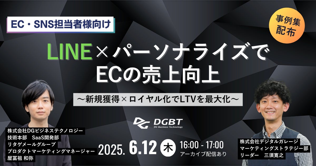 デジタルビジネス総合支援を手掛ける株式会社DGビジネステクノロジー(デジタルガレージグループ会社 /本社:東京都渋谷区、代表取締役 兼 社長執行役員:清水 和徳、以下:DGBT)は、2025年6月12日(木)に無料オンラインセミナー「LINE×パーソナライズでECの売上向上~新規獲得×ロイヤル化でLTVを最大化~」を開催します。