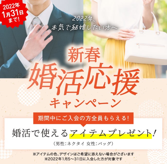 2022年から本気で結婚したいと思われている方へ“新春婚活応援キャンペーン”を実施いたします。2022年1月5日(水)~1月31日(月)までにご入会いただくと、婚活で役立つ便利アイテムが手に入ります。