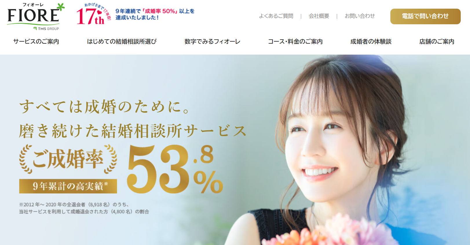 - 結婚相談所フィオーレは9年累計の高実績「ご成婚率50%以上」のサービスです