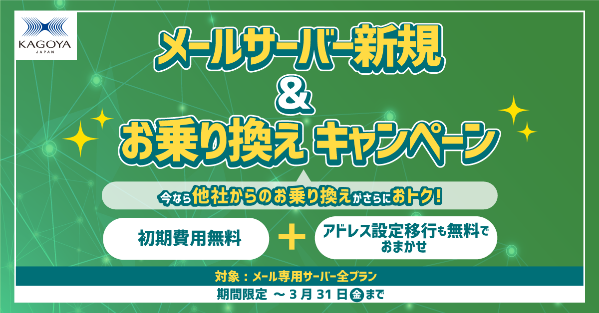 カゴヤ・ジャパン株式会社(本社:京都府京都市、代表取締役社長:岡村 武)は、メールプラン 専用タイプにおきまして、3月31日(金) まで『メールサーバー 新規&お乗り換えキャンペーン』を開催いたします。