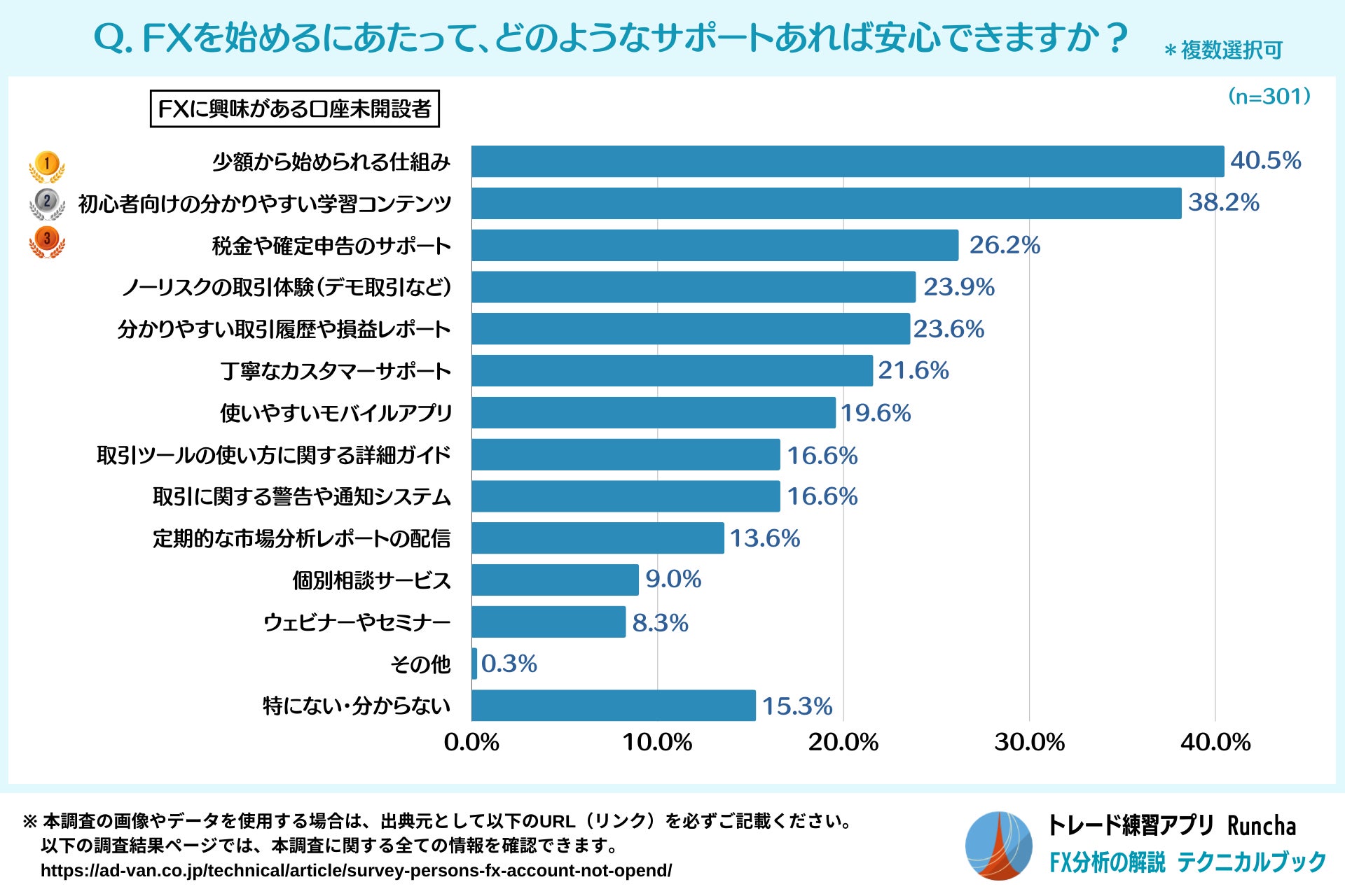 続いて、FXに興味がある口座未開設者がFXを始めるにあたって、どのようなサポートがあれば安心できるかを示したグラフです。