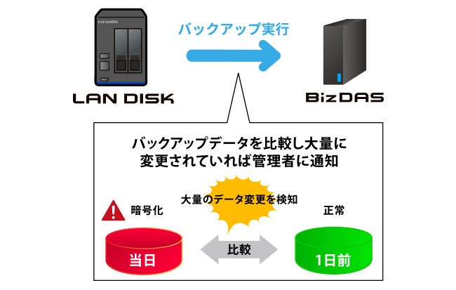 ランディスクは、バックアップ実行時に前回のバックアップデータと内容を比較し、大量の変更が確認された場合はシステム管理者へ通知します。セキュリティインシデント発生時に重要な初動対応を促し、被害拡大の抑制に貢献します。