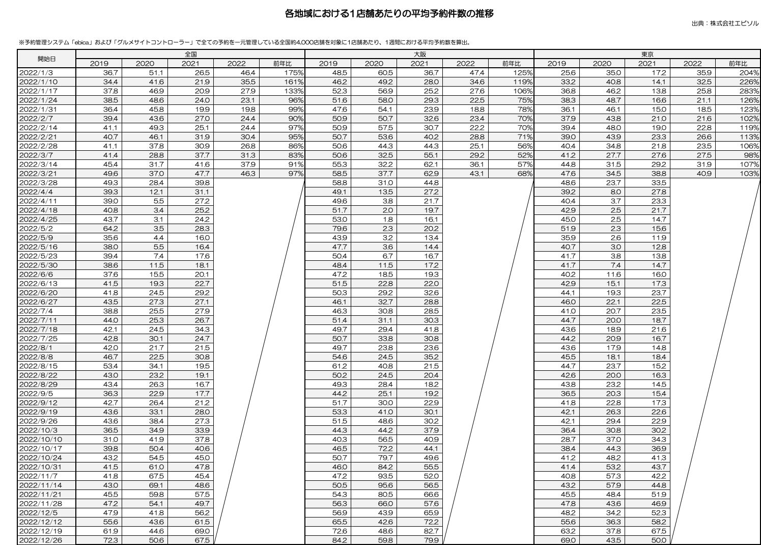 飲食店向け予約管理システム「ebica」を運営する株式会社エビソル(本社:東京都渋谷区、代表取締役:田中 宏彰、以下、エビソル)は、新型コロナウイルス感染症の拡大防止策に伴い大幅に自粛営業を余儀なくされている飲食店の厳しい状況を知っていただくことを目的に、飲食店の前年対比の予約状況(※1)を公開しております。本日は、新たに2022年3月1日〜3月27日の4週間分を更新した2022年3月度のレポートを公開します。