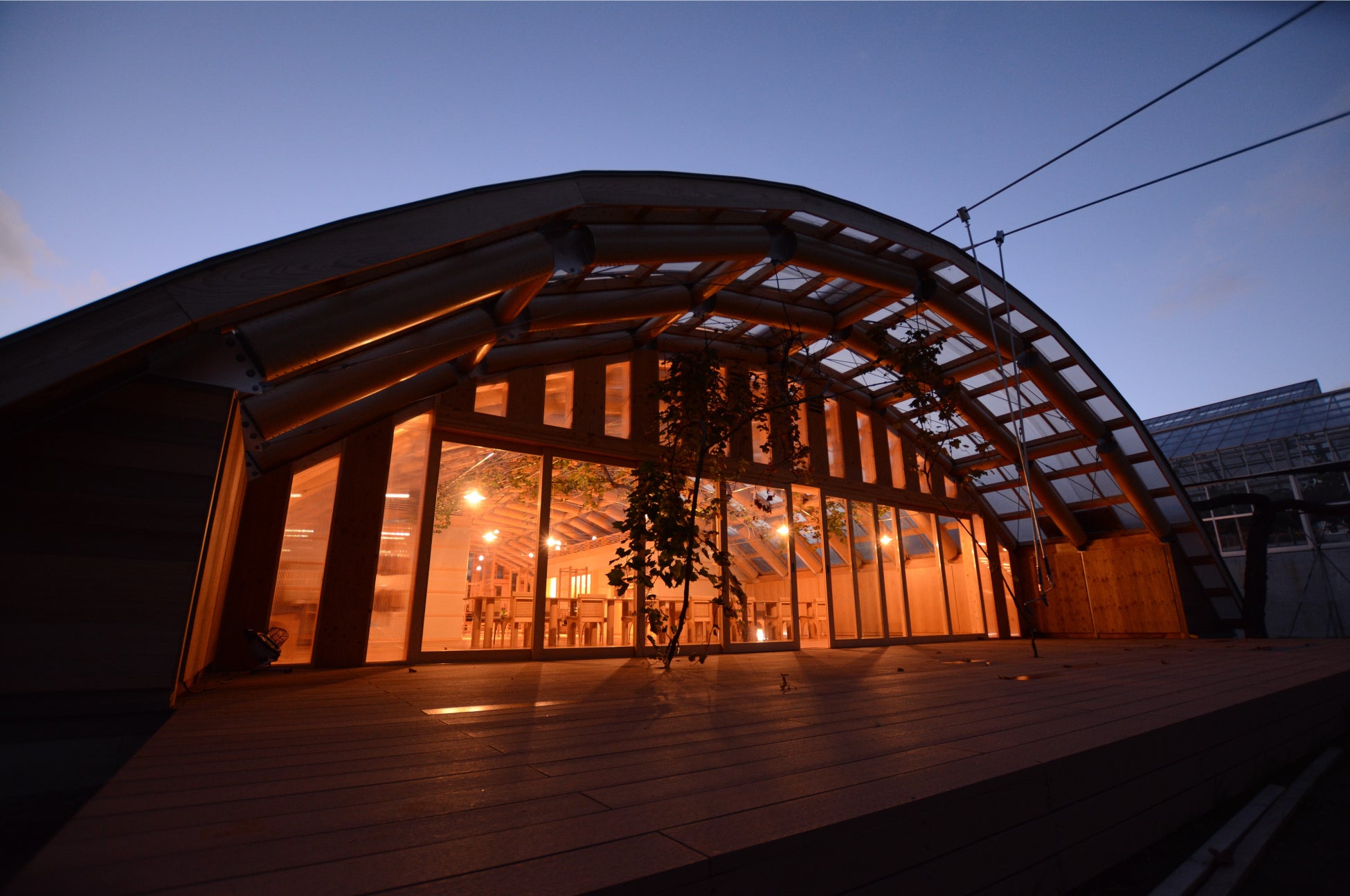 ここは、日本を代表する建築家 坂 茂(バン シゲル)氏の設計によるドーム型の紙管温室で、それをレストランへコンバージョンしたもの。内部にもぶどうの棚が設置され、建築とぶどうの木の融合による新しい世界が広がります。