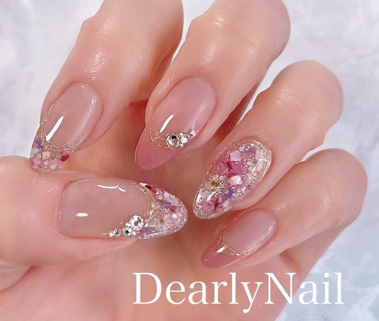 キラキラのラメとシェルが押し花を囲む様子は、とびきりロマンチック♡
