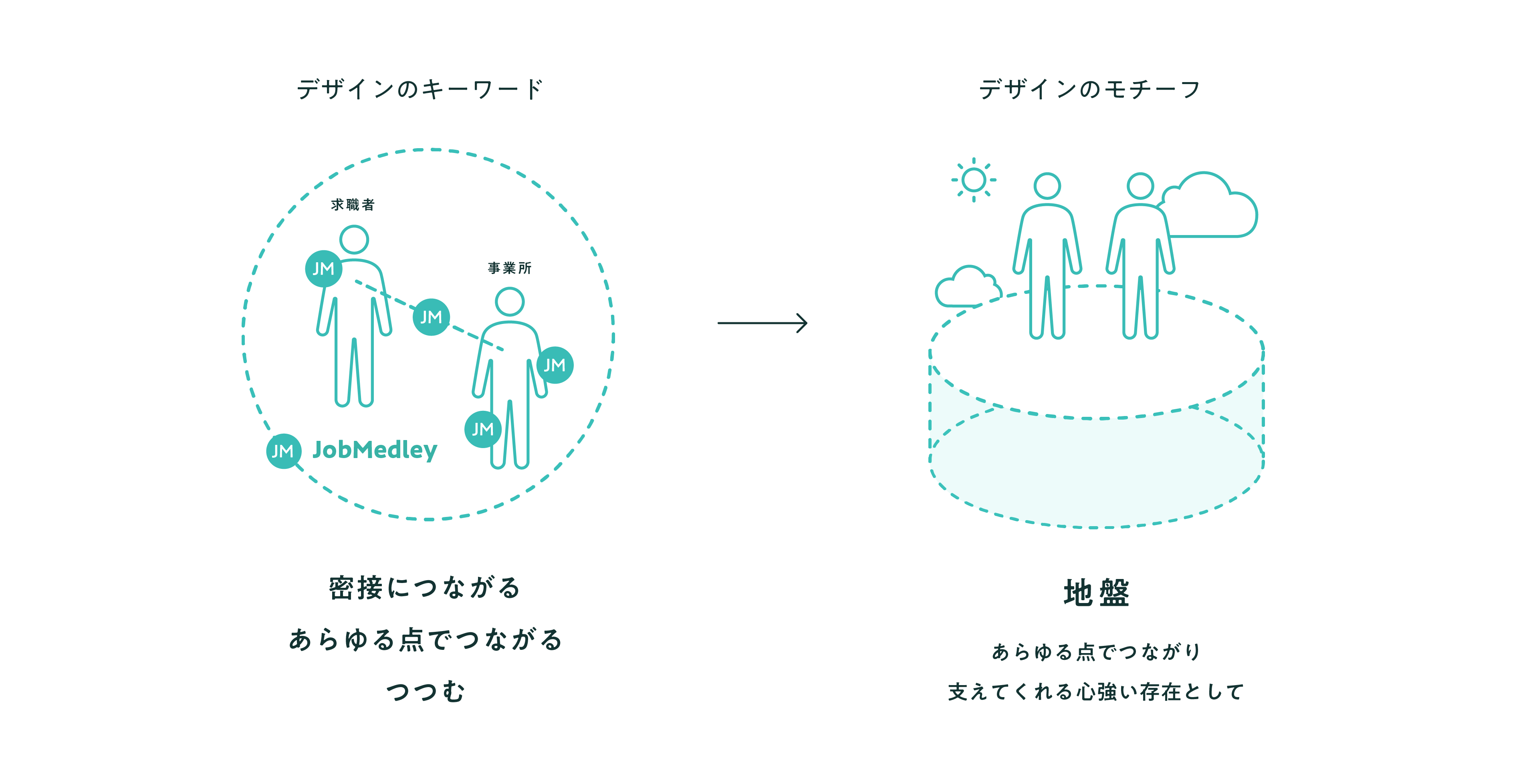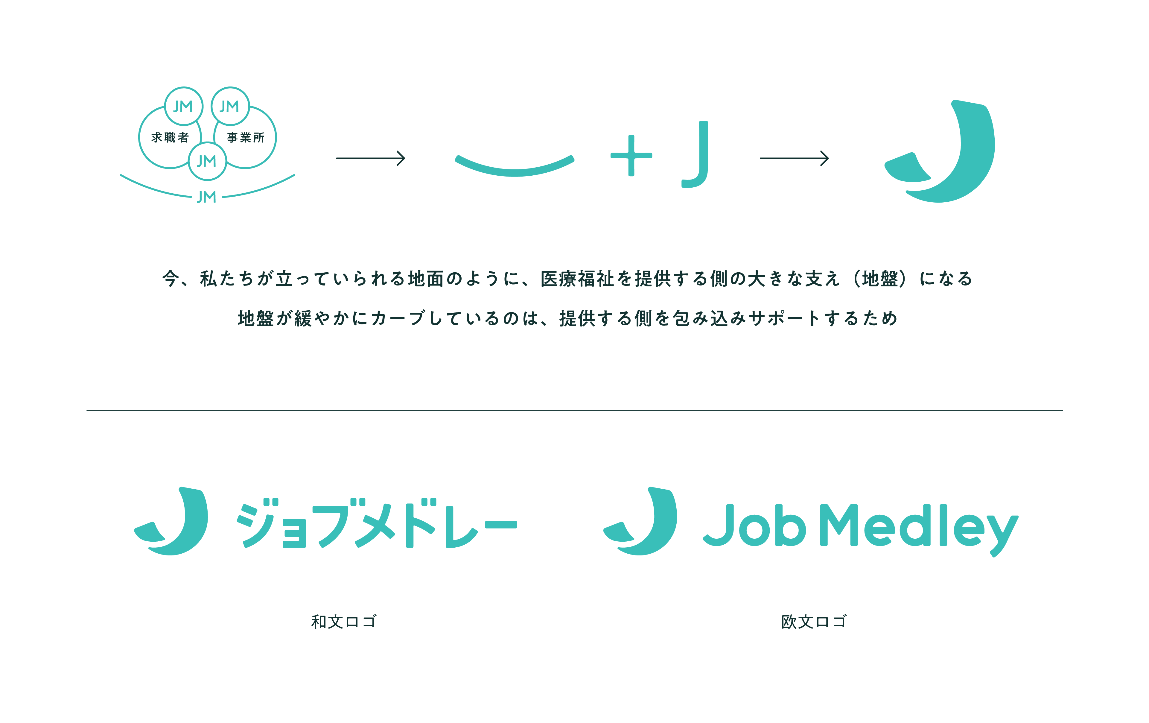 ジョブメドレーのサービス規模ならびに領域の拡大に伴い、ロゴデザインをリニューアルしました。新しいロゴでは、ジョブメドレーが、一人ひとり・チーム・組織そして業界全体を支える医療福祉業界の新しい「地盤」となり、「働くこと」を全面的にサポートすることを表現しています。また、グローバルで利用されるサービスになることを目指し、英語表記と日本語表記の両パターンを作成しています。
