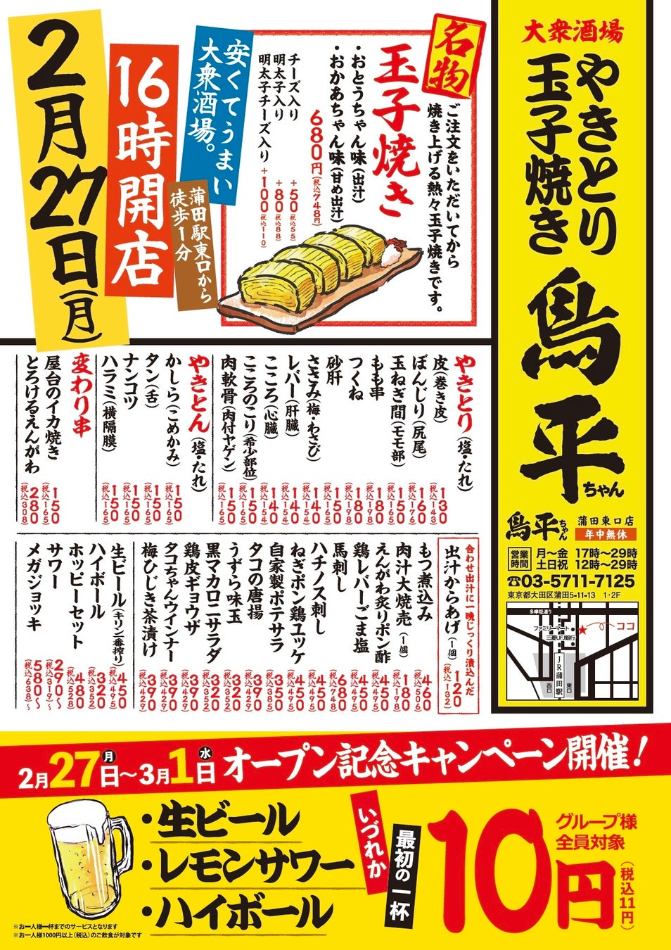 2023年2月27日(月)16:00 大衆酒場「鳥平ちゃん 蒲田東口店」オープン!
