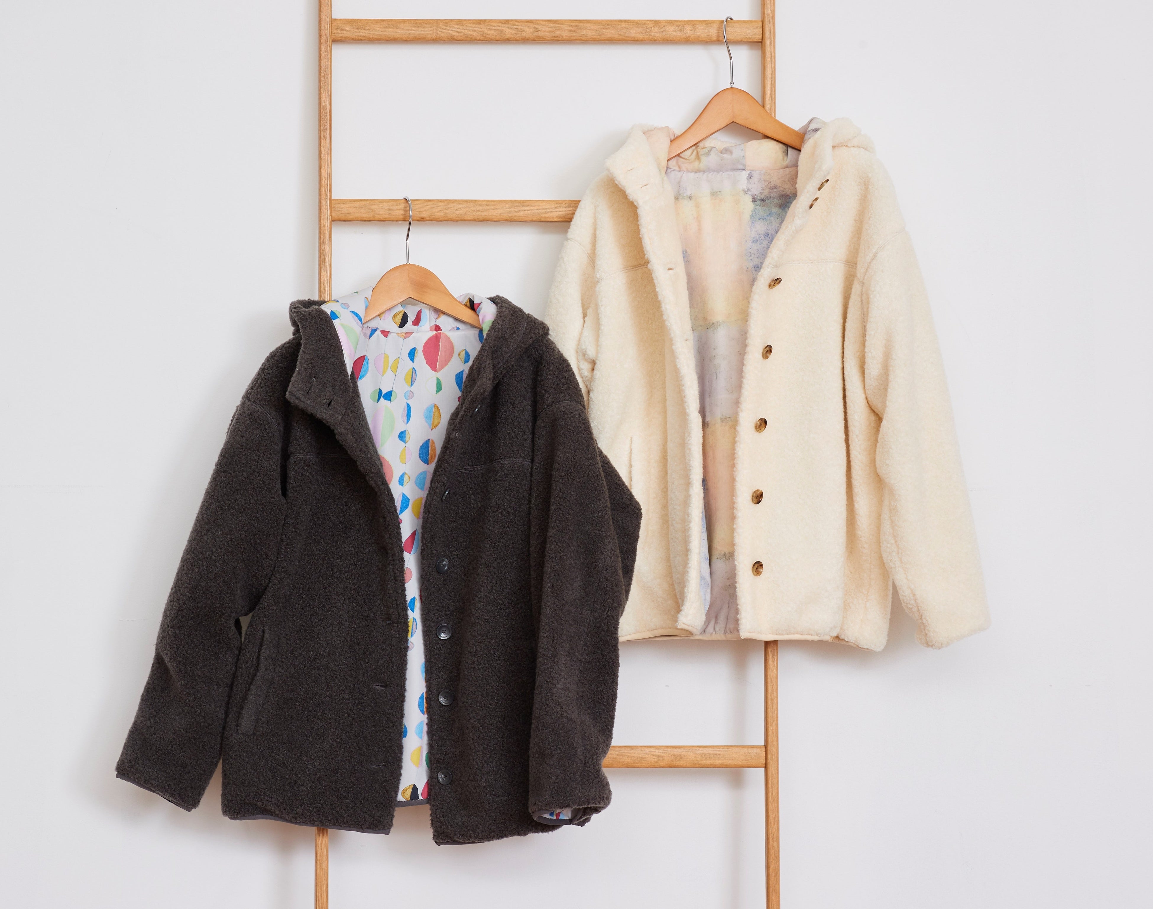● 内側から覗く鮮やかな裏地に使用されたアートが、冬の着こなしに彩りを与えます