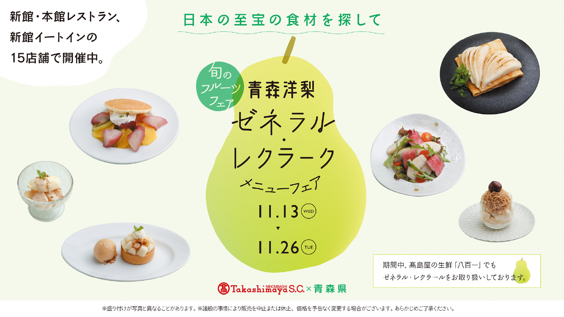 日本橋高島屋S.C.の新館・本館レストラン、新館イートインの15店舗で11月13日よりフェアを開催いたします。青森県南部地方に広がる日本一のゼネラル・レクラーク産地からお届け。西洋なしのもつエレガントな風味を召し上がれ!