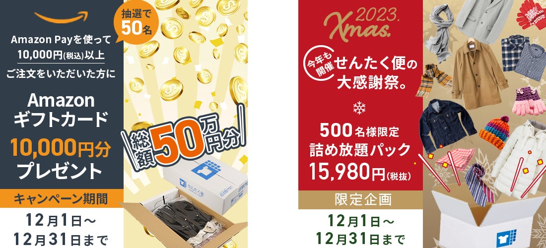 キャンペーン期間中に『せんたく便』のいずれかのパック(最速・保管・ふとん・くつ)を、1万円(税込)以上ご購入いただき、Amazon Payで決済していただいたお客様の中から、抽選で50名様にAmazonギフト券をプレゼントします。