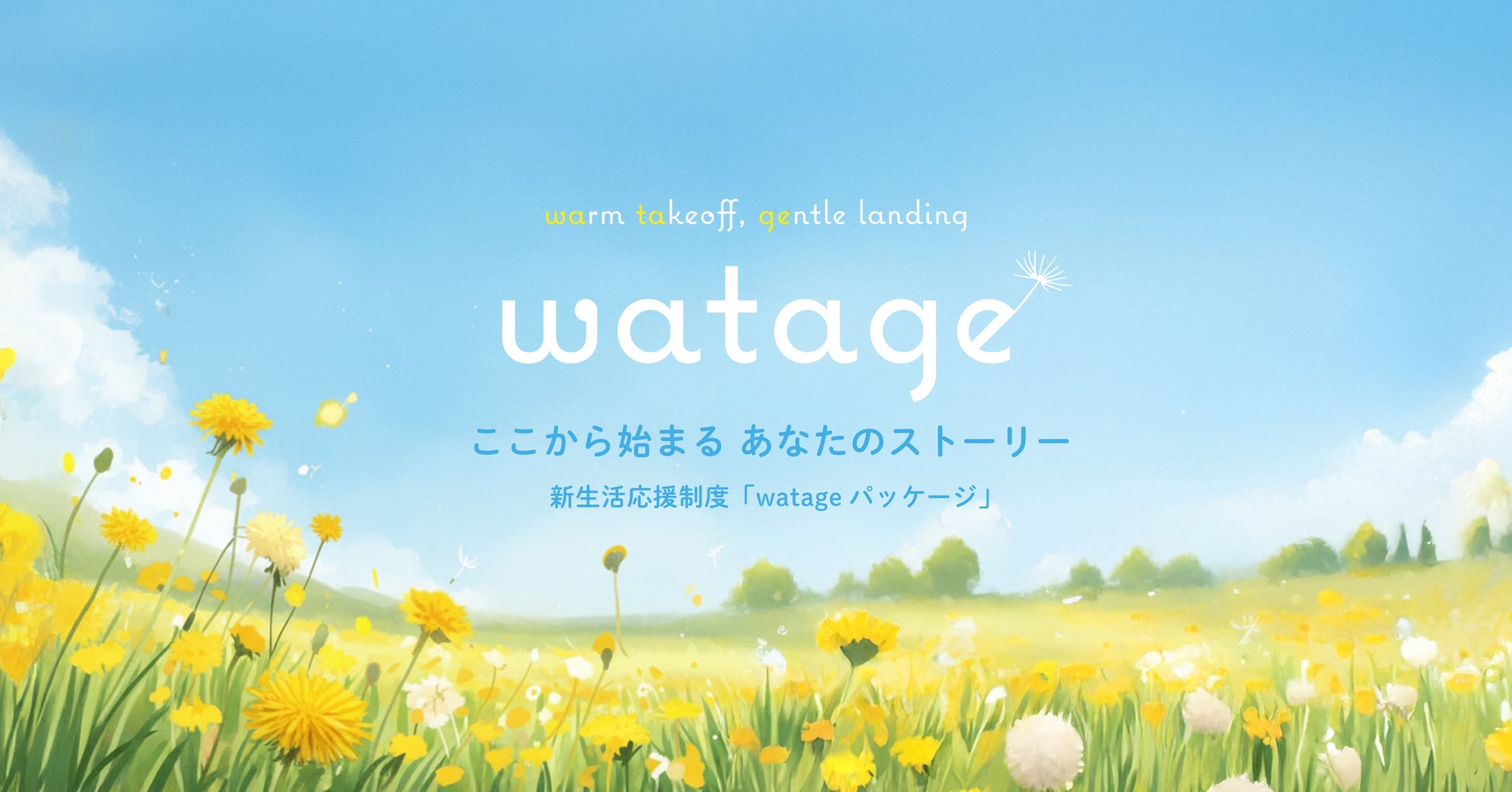 watageは、入社を機に新しい環境へ飛び込む社員の暮らしを支える8つのサポートを束ねたパッケージです。たんぽぽの綿毛が新しい土地へ飛び、根を張り、芽を伸ばし、花を咲かせていく姿をモチーフに、未知の環境に一歩を踏み出す社員にそっと寄り添い、成長を支える存在でありたいという想いを込めています。名称は、warm takeoff, gentle landing(あたたかく飛び立ち、やさしく着地する)というコンセプトに着想を得ています。