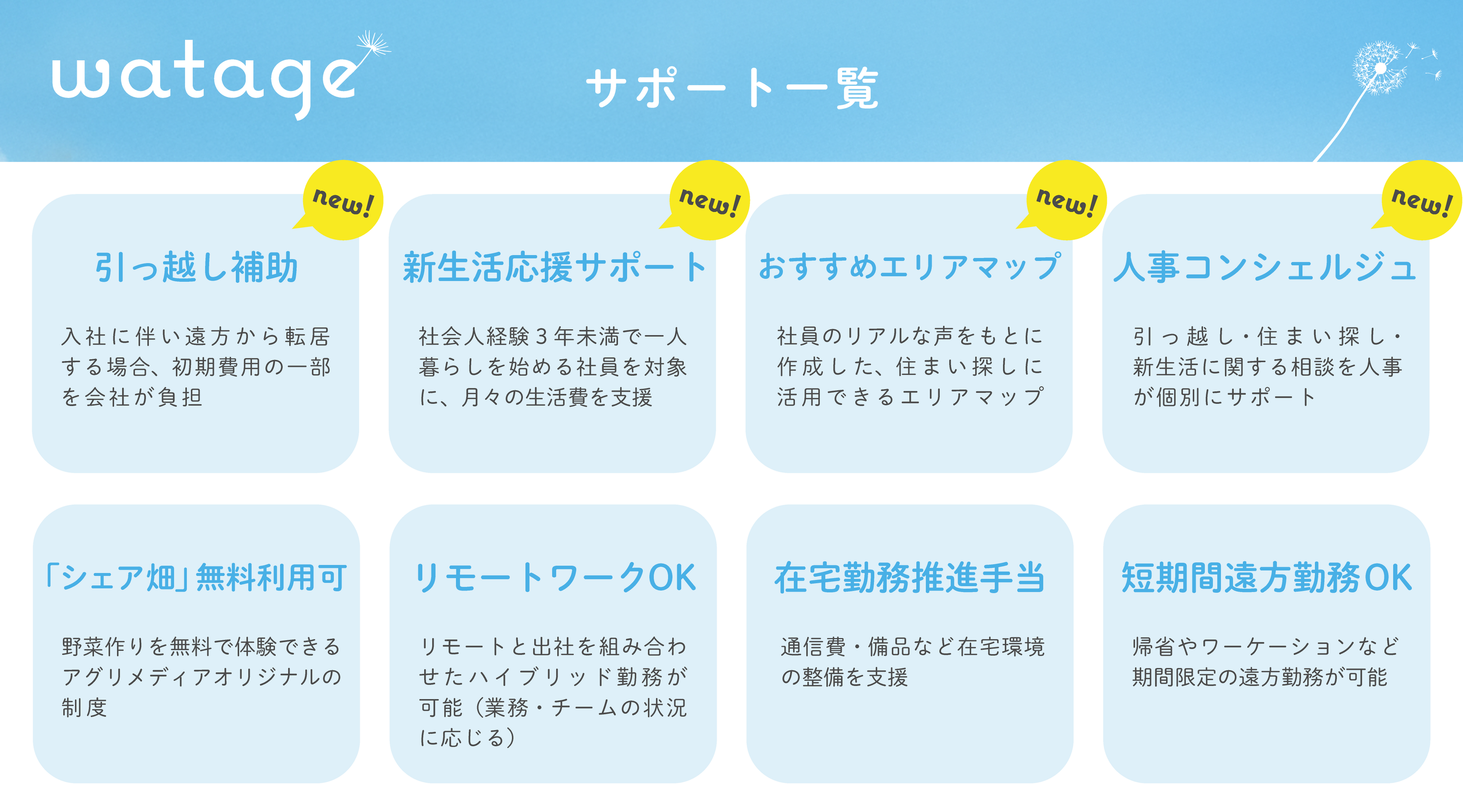 株式会社アグリメディア(本社:東京都目黒区、代表取締役:諸藤貴志、以下「アグリメディア」)は、新卒1年目社員の発案により、入社に伴い新たな環境で生活を始める若手社員をサポートする福利厚生パッケージ「watage(わたげ)」を新設し、12月1日より提供を開始しました。