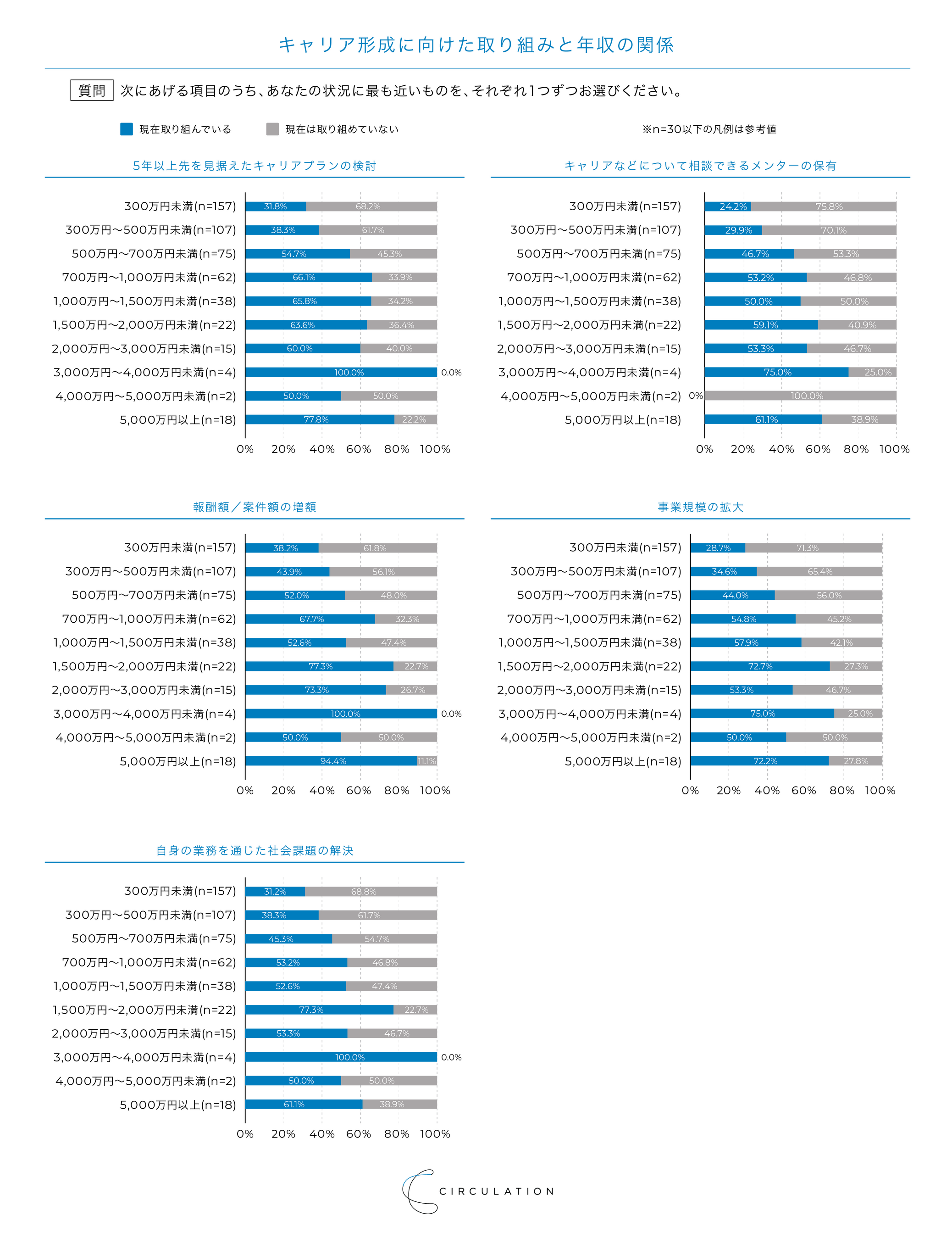 特に「5年以上先を見据えたキャリアプランの設計」や「報酬の増額」では、年収700万円以上の回答者の6割以上が取り組んでいました。