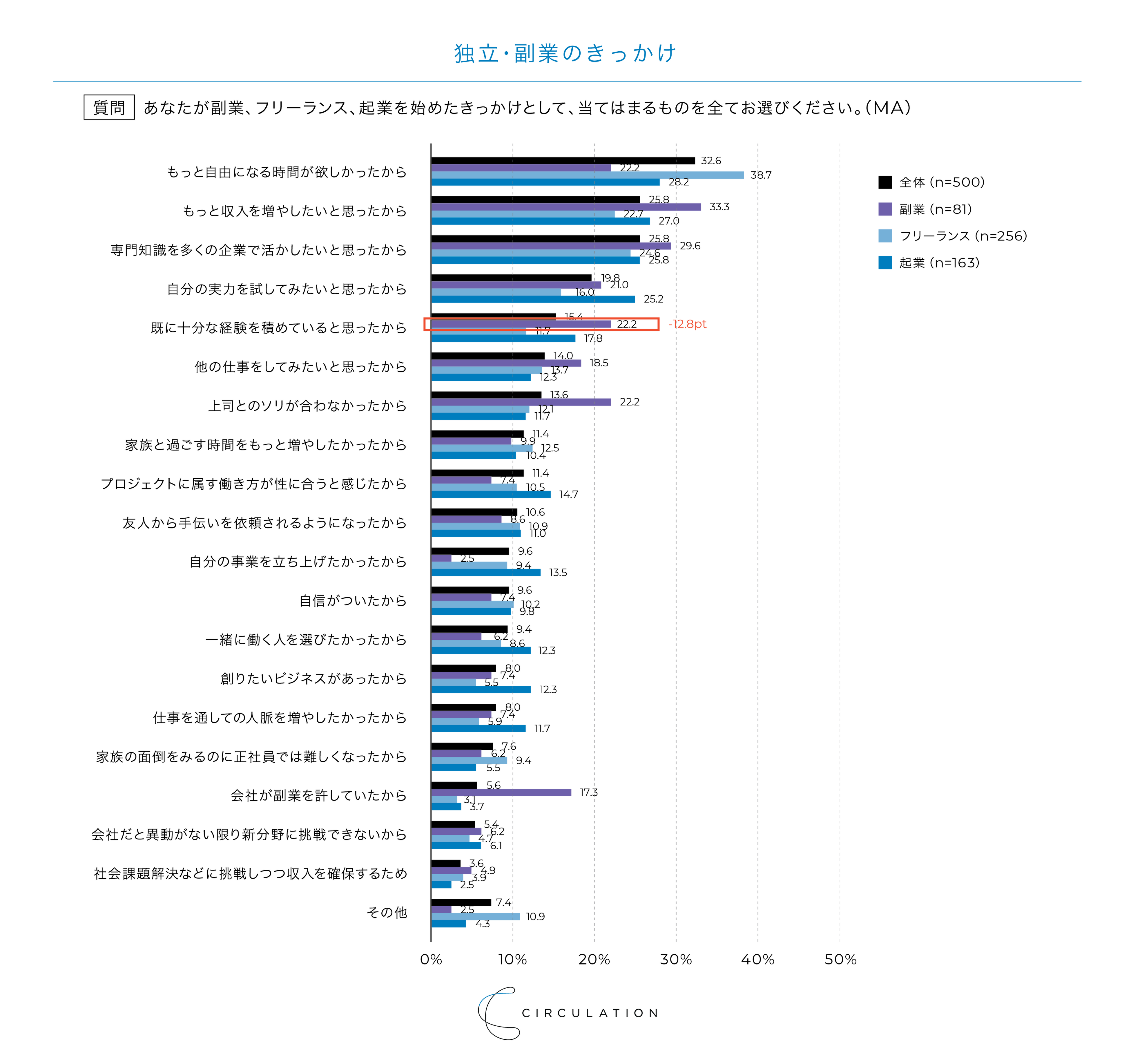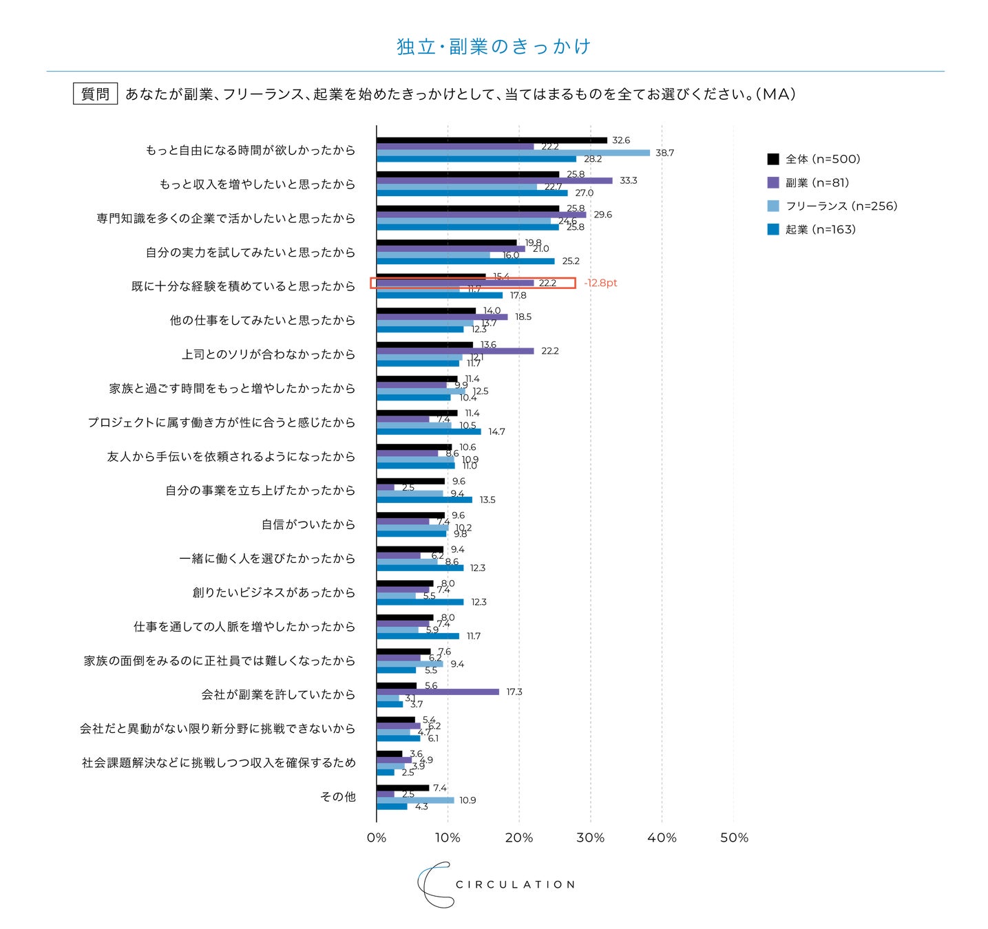 総合的な順位は2022年から変わらず「自由になる時間(32.6%)」「収入(25.8%)」「専門知識を活かしたい(25.8%)」だったものの、副業者の中で「既に十分な経験を積めていると思った(22.2%)」項目が昨年に比べて10ポイント以上スコアを下げ、経験を積む前に副業を始める傾向が見受けられます。
