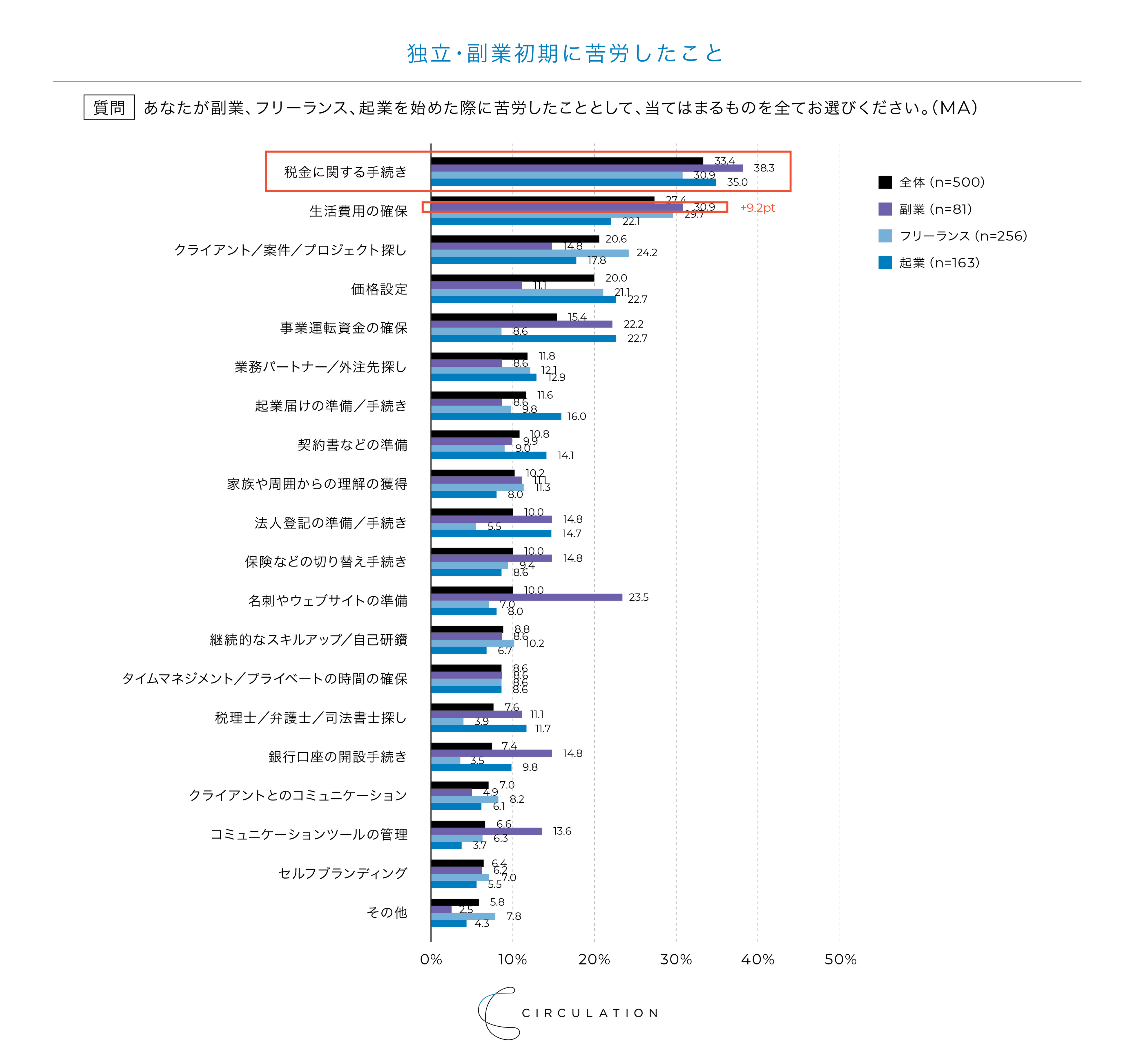 副業・フリーランス・起業全てが苦労したのは「税金に関する手続き(33.4%)」