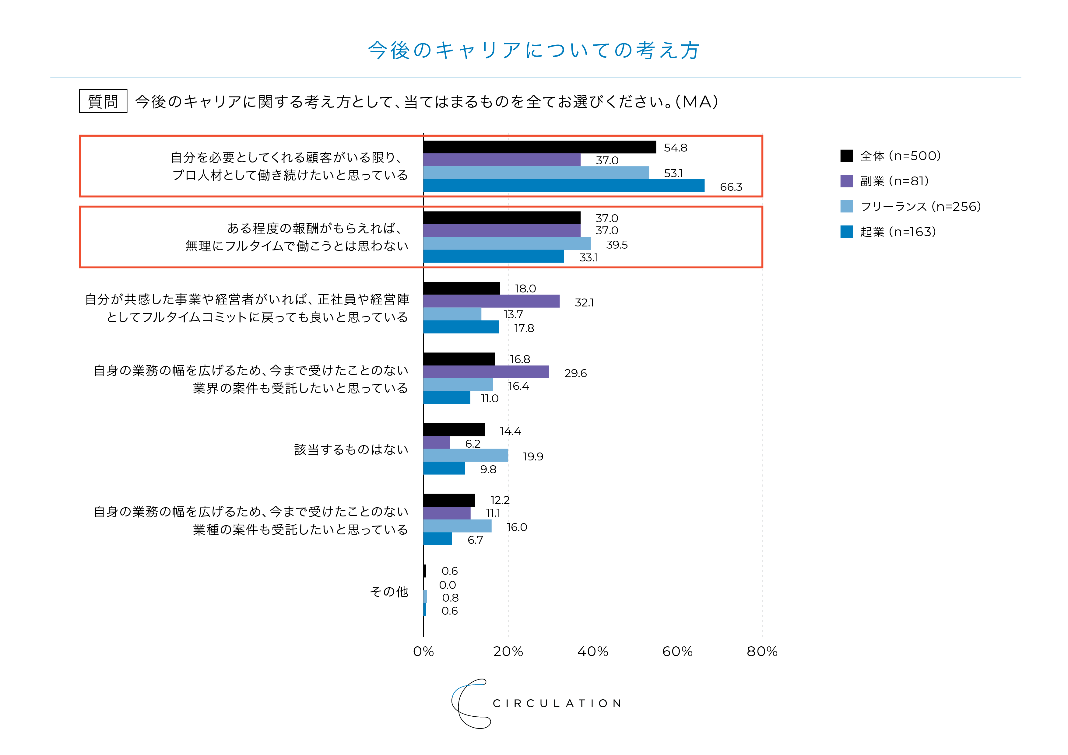 副業では「必要としてくれる顧客がいる限り、プロ人材として働き続けたい(37.0%)」「ある程度の報酬がもらえれば、無理にフルタイムで働こうとは思わない(37.0%)」と考えるケースが多く、自由度を重視しています。フリーランスや起業では特に、「必要としてくれる顧客がいる限り、プロ人材として働き続けたい(53.1%/66.3%)」を占める割合が圧倒的に高く、フリーランスは「ある程度の報酬がもらえれば、無理にフルタイムで働こうとは思わない(39.5%)」も多いことが分かりました。