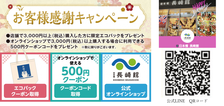 長崎県のアンテナショップ「日本橋 長崎館」(東京都中央区日本橋 2-1-3 運営事業者:デイ・ナイト株式会社)では、本年 3 月 7 日に開館 6 周年を迎えることを記念して、3 月 10 日(木)~3 月 21 日(月)の間、「日本橋 長崎館」公式 LINE に登録していただいているお客様を対象とした「お客様感謝キャンペーン」を実施します。