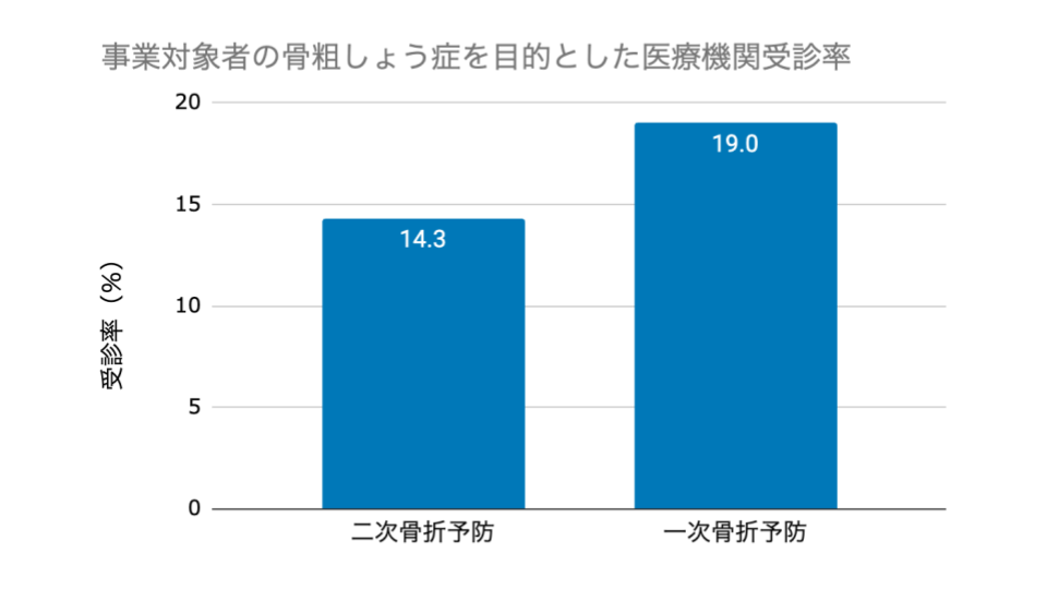 大阪市民へ骨粗しょう症受診勧奨を実施し、受診率14.3%(二次骨折予防)、19.0%(一次骨折予防)を達成