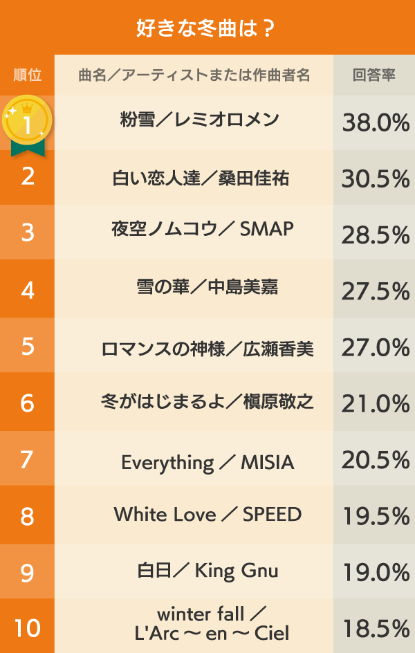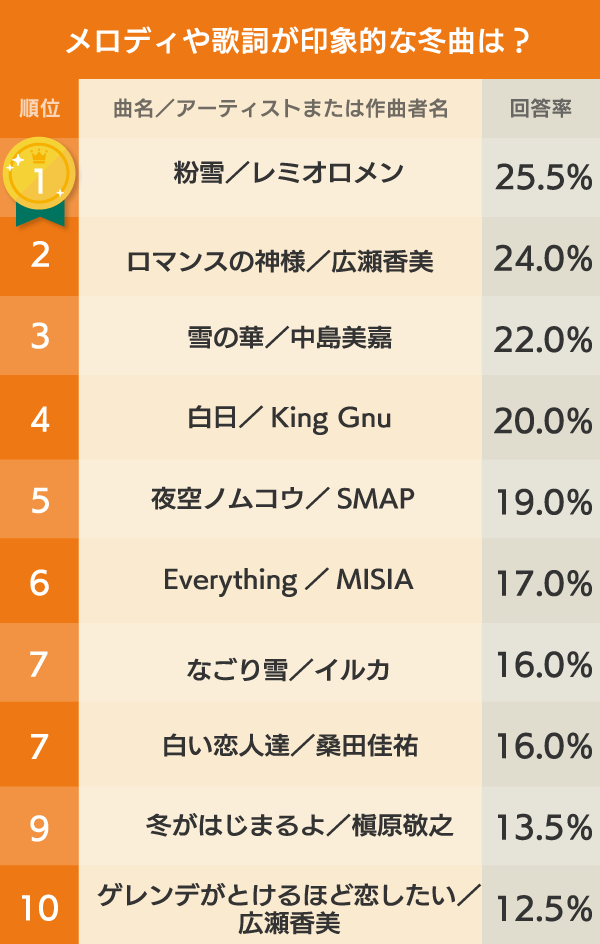 第1位『粉雪(レミオロメン)』25.5%、第2位『ロマンスの神様(広瀬香美)』24.0% 第3位『雪の華(中島美嘉)』22.0%、第4位『白日(King Gnu)』20.0%、第5位『夜空ノムコウ(SMAP)』19.0%