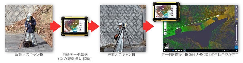 スキャニングした複数の点群データは、高速WiFi通信でタブレットPCへ自動転送され、タブレットPC内のソフトウェアによってすばやく合成ができることから、現場の作業員は、合成後の3D形状をリアルタイムに確認しながらスキャニングを進めることが可能になります。