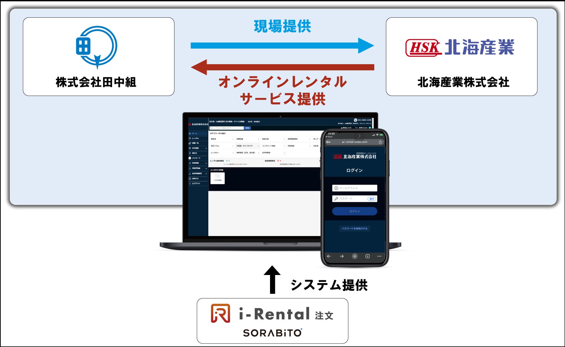 SORABITO株式会社(代表取締役:博多一晃、本社:東京都中央区、以下「SORABITO」)は、北海道を拠点とする創業120年の道内大手建設会社の株式会社田中組(代表取締役社長:松村敏文、本社:北海道札幌市、以下「田中組」)と、北海産業株式会社(代表取締役:伊藤光雄、本社:北海道苫小牧市、以下「北海産業」)と共に、建機レンタルDX SaaSプロダクト「i-Rental 注文」を活用した実証実験を10月2日から北海道で初めて開始したことをお知らせします。