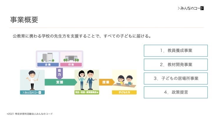 みんなのコードは、「子どもたちがデジタルの価値創造者となることで、次の世界を創っていく」をビジョンに掲げ、4つの事業を推進しています。