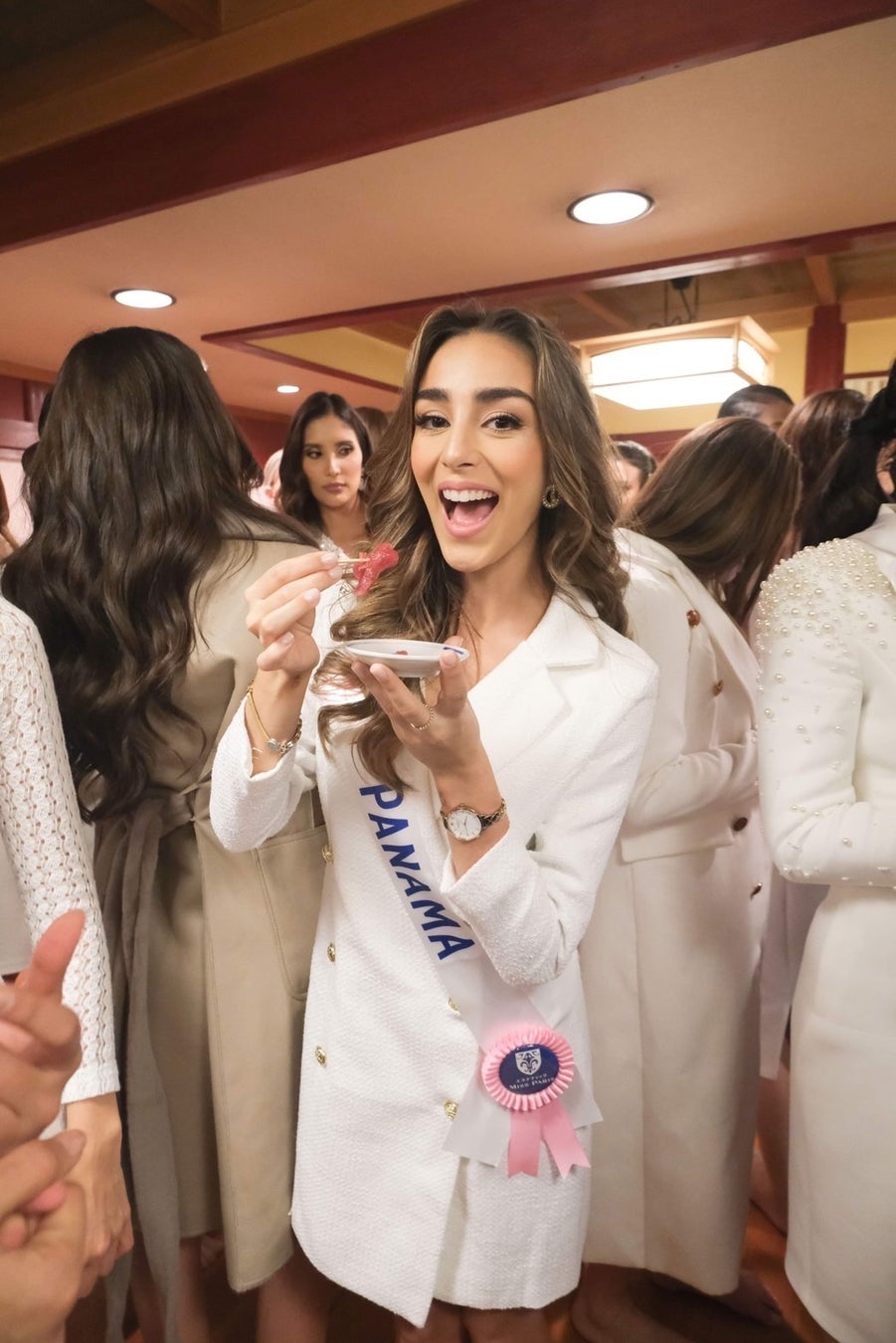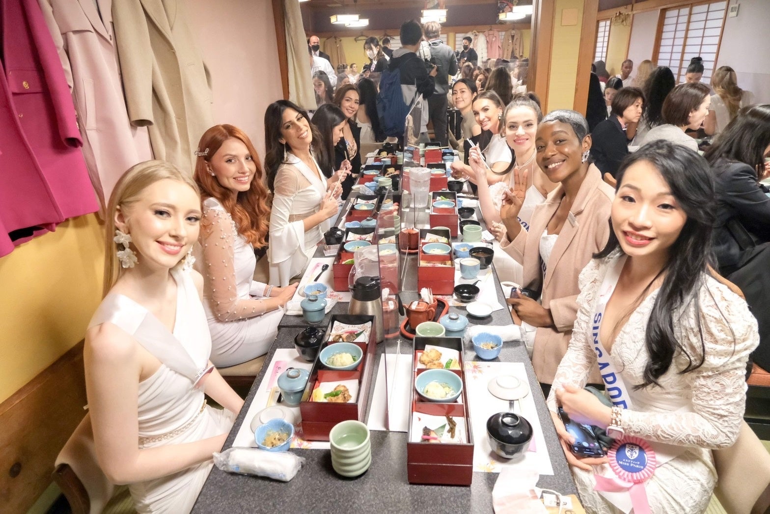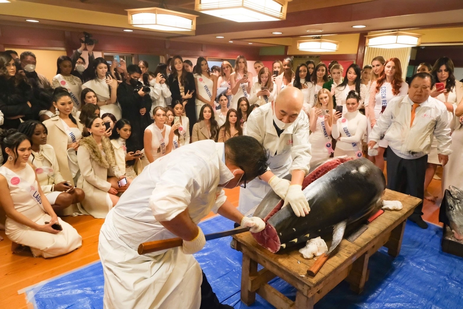 2022年12月01日(木)に、ミス・インターナショナル世界大会出場者は、東京都中央区築地にある「すしざんまい 奥の院」を訪問しました。現地では、すしざんまいの名物社長である木村社長の演出のもと行われたマグロの解体ショーや、日本が誇る食文化の一つである寿司を試食し、日本の文化に触れました。出場者たちは、マグロの解体ショーや寿司の試食中にも感想などの意見を交わし、交流を深めました。