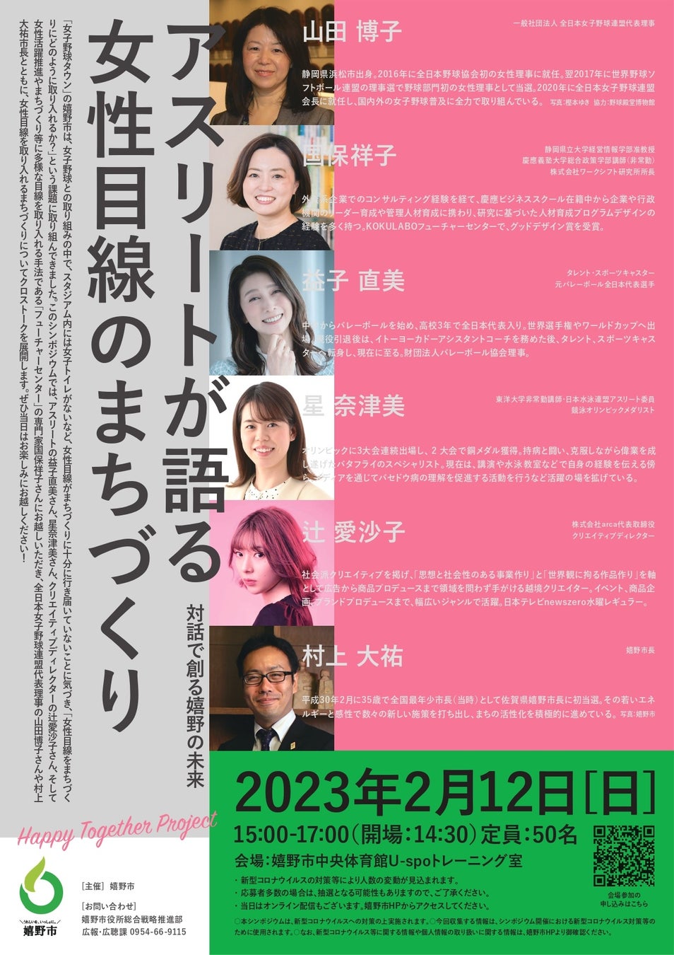 今回のシンポジウムでは、元バレーボール日本代表の益子直美さん、元競泳日本代表の星奈津美さん、クリエイティブ・ディレクターの辻愛沙子さんが登壇します。さらに、全日本女子野球連盟代表理事の山田博子さんや嬉野市長の村上大祐さん、静岡県立大学経営情報学部准教授 国保祥子さんとともに、女性目線を取り入れるまちづくりについてクロストークを展開します。