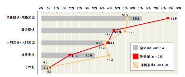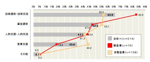 ○ 製造業では、「技術提供・技術交流」が8割以上であり、技術面での交流が中心であることが特徴となりました。