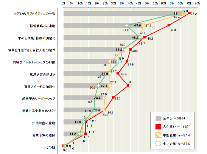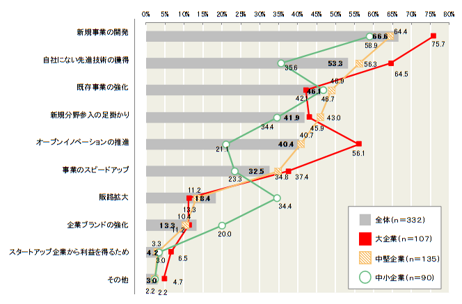 ○ 企業規模別でみると、大企業はこの傾向が強く、「新規事業の開発」(75.7%)、「自社にない先進技術の獲得」(64.5%)と全体と比較して高い結果となりました。対して中小企業は先述の2項目の比率は全体と比較して低く、「販路拡大」が全体より16ポイント高いことが特徴的です。