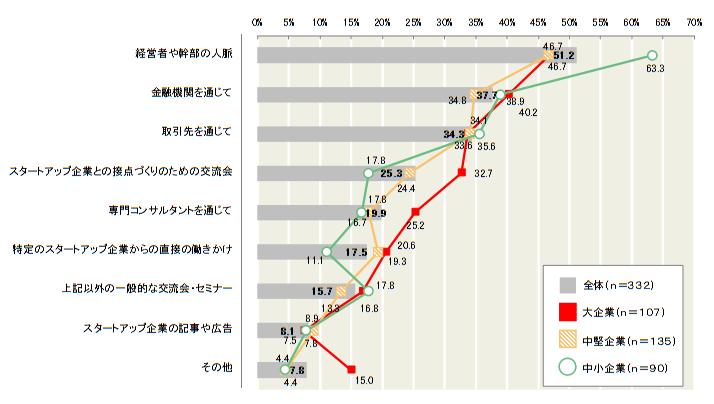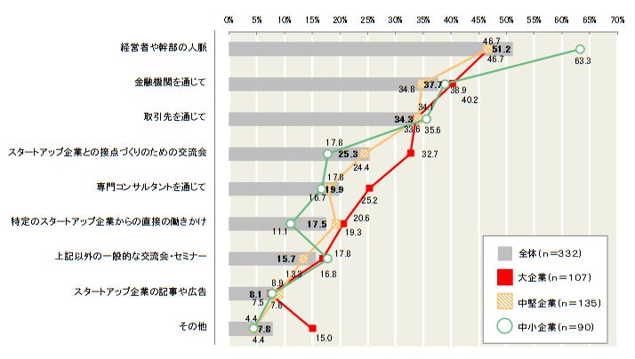 ○ 企業規模別でみると、大企業は「専門コンサルタントを通じて」「スタートアップ企業との接点づくりのための交流会」が全体と比べて高く、企業側から積極的に働きかけを行っていることがわかりました。一方で、中小企業は「経営者や幹部の人脈」の比率が高くなっています。